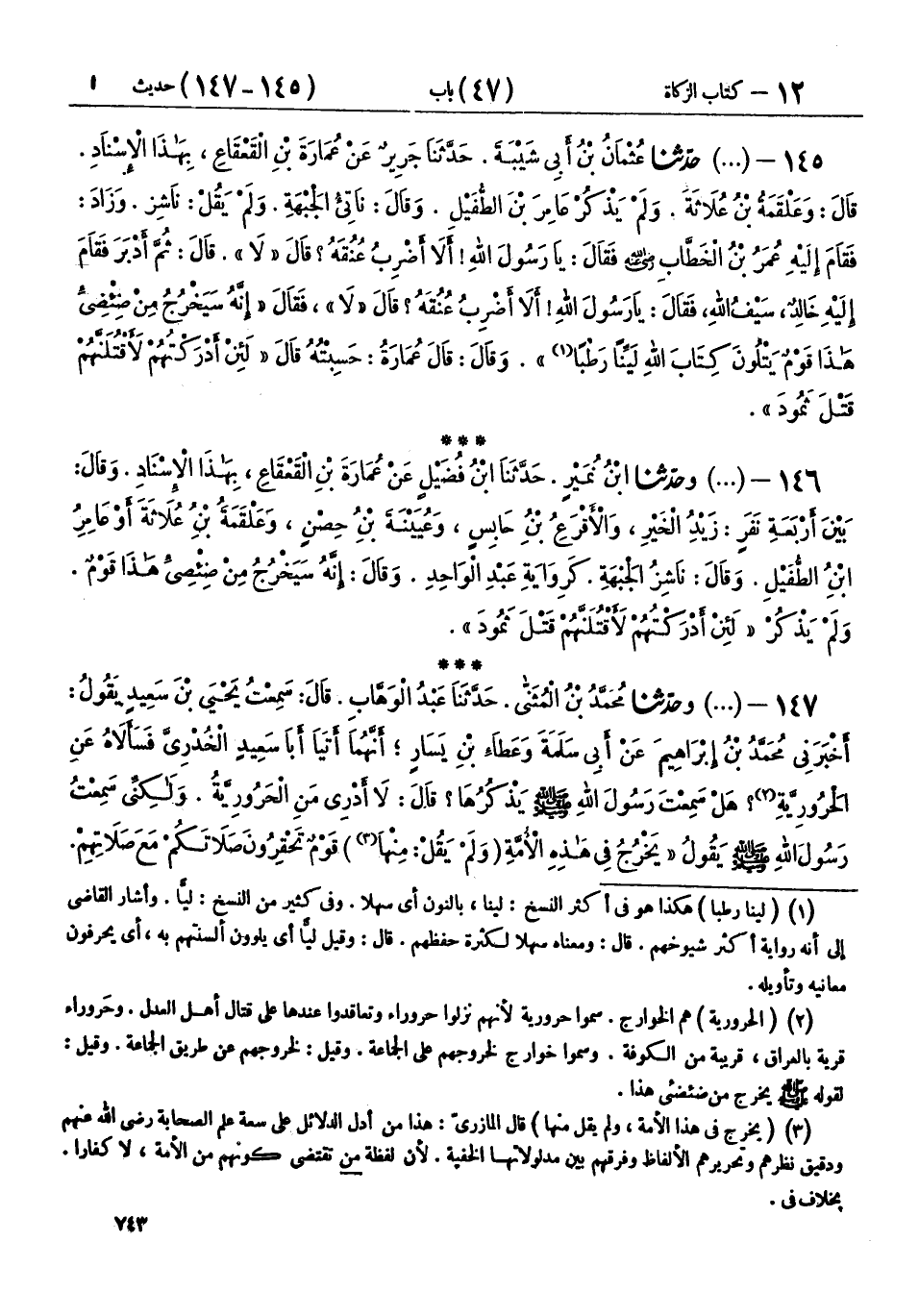 147 - (1064) وحَدَّثَنَا مُحَمَّدُ بْنُ الْمُثَنَّى، حَدَّثَنَا عَبْدُ الْوَهَّابِ، قَالَ: سَمِعْتُ يَحْيَى بْنَ سَعِيدٍ، يَقُولُ: أَخْبَرَنِي مُحَمَّدُ بْنُ إِبْرَاهِيمَ، عَنْ أَبِي سَلَمَةَ، وَعَطَاءِ بْنِ يَسَارٍ، أَنَّهُمَا أَتَيَا أَبَا سَعِيدٍ الْخُدْرِيَّ، فَسَأَلَاهُ عَنِ الْحَرُورِيَّةِ، هَلْ سَمِعْتَ رَسُولَ اللهِ صَلَّى اللهُ عَلَيْهِ وَسَلَّمَ يَذْكُرُهَا قَالَ: لَا أَدْرِي مَنِ الْحَرُورِيَّةُ، وَلَكِنِّي سَمِعْتُ رَسُولَ اللهِ صَلَّى اللهُ عَلَيْهِ وَسَلَّمَ، يَقُولُ: " §يَخْرُجُ فِي هَذِهِ الْأُمَّةِ - وَلَمْ يَقُلْ: مِنْهَا - قَوْمٌ تَحْقِرُونَ صَلَاتَكُمْ مَعَ صَلَاتِهِمْ، فَيَقْرَءُونَ الْقُرْآنَ، لَا يُجَاوِزُ حُلُوقَهُمْ - أَوْ حَنَاجِرَهُمْ - يَمْرُقُونَ مِنَ الدِّينِ مُرُوقَ السَّهْمِ مِنَ الرَّمِيَّةِ، فَيَنْظُرُ الرَّامِي إِلَى سَهْمِهِ إِلَى نَصْلِهِ إِلَى رِصَافِهِ، فَيَتَمَارَى فِي الْفُوقَةِ، هَلْ عَلِقَ بِهَا مِنَ الدَّمِ شَيْءٌ "