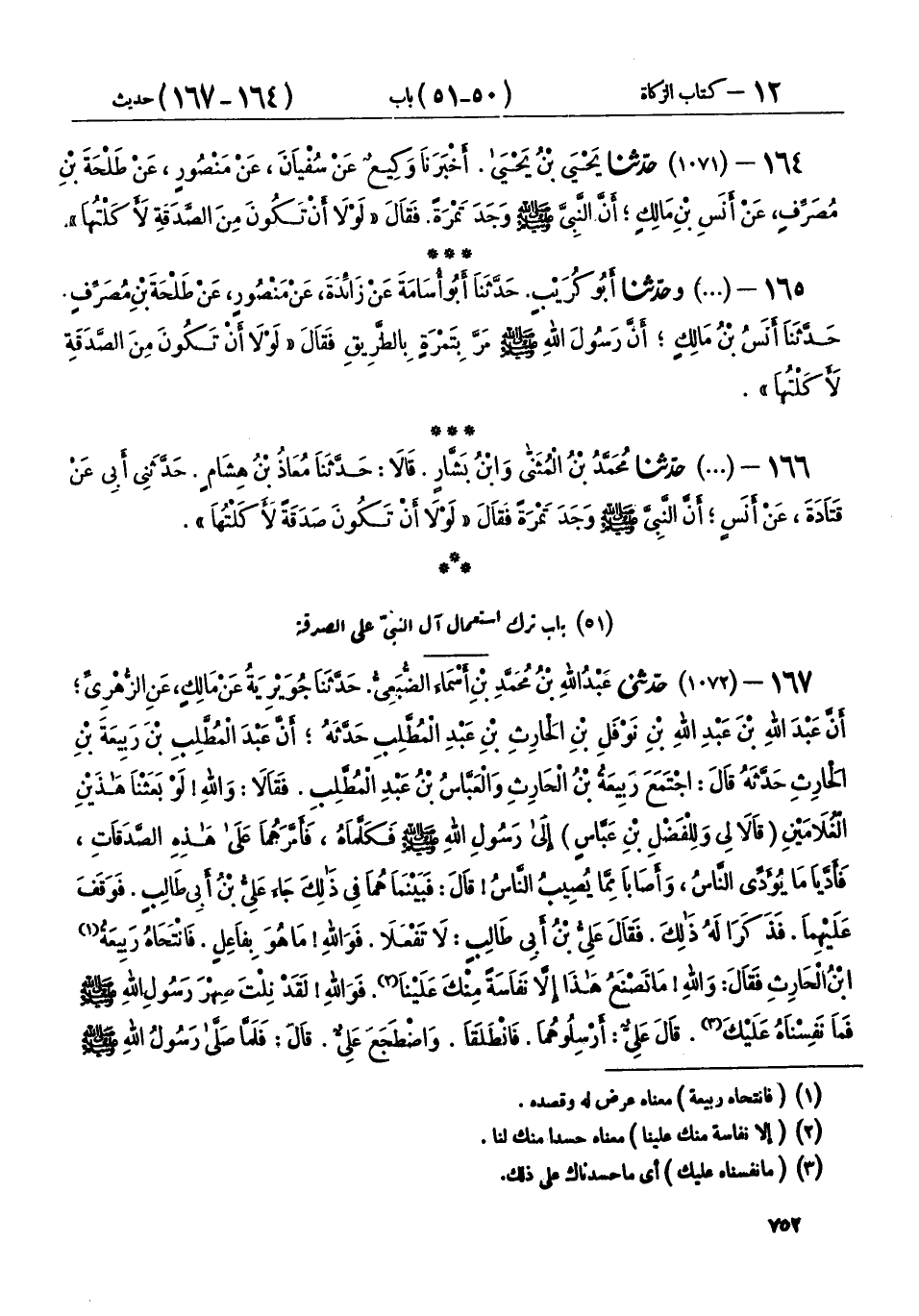 165 - (1071) وحَدَّثَنَا أَبُو كُرَيْبٍ، حَدَّثَنَا أَبُو أُسَامَةَ، عَنْ زَائِدَةَ، عَنْ مَنْصُورٍ، عَنْ طَلْحَةَ بْنِ مُصَرِّفٍ، حَدَّثَنَا أَنَسُ بْنُ مَالِكٍ، أَنَّ رَسُولَ اللهِ صَلَّى اللهُ عَلَيْهِ وَسَلَّمَ مَرَّ بِتَمْرَةٍ بِالطَّرِيقِ، فَقَالَ: «§لَوْلَا أَنْ تَكُونَ مِنَ الصَّدَقَةِ لَأَكَلْتُهَا»