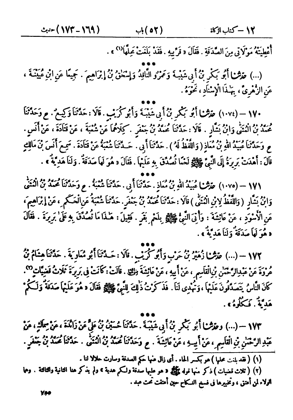 172 - (1075) حَدَّثَنَا زُهَيْرُ بْنُ حَرْبٍ، وَأَبُو كُرَيْبٍ، قَالَا: حَدَّثَنَا أَبُو مُعَاوِيَةَ، حَدَّثَنَا هِشَامُ بْنُ عُرْوَةَ، عَنْ عَبْدِ الرَّحْمَنِ بْنِ الْقَاسِمِ، عَنْ أَبِيهِ، عَنْ عَائِشَةَ رَضِيَ اللهُ عَنْهَا، قَالَتْ: كَانَتْ فِي بَرِيرَةَ ثَلَاثُ قَضِيَّاتٍ كَانَ النَّاسُ يَتَصَدَّقُونَ عَلَيْهَا، وَتُهْدِي لَنَا، فَذَكَرْتُ ذَلِكَ لِلنَّبِيِّ صَلَّى اللهُ عَلَيْهِ وَسَلَّمَ فَقَالَ: «§هُوَ عَلَيْهَا صَدَقَةٌ وَلَكُمْ هَدِيَّةٌ فَكُلُوهُ»