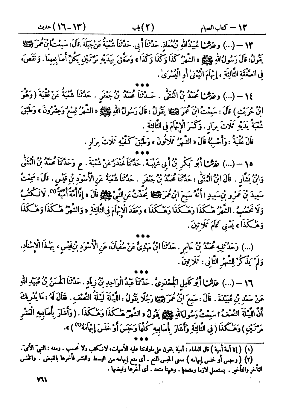 15 - (1080) حَدَّثَنَا أَبُو بَكْرِ بْنُ أَبِي شَيْبَةَ، حَدَّثَنَا غُنْدَرٌ، عَنْ شُعْبَةَ، ح وحَدَّثَنَا مُحَمَّدُ بْنُ الْمُثَنَّى، وَابْنُ بَشَّارٍ، قَالَ ابْنُ الْمُثَنَّى: حَدَّثَنَا مُحَمَّدُ بْنُ جَعْفَرٍ، حَدَّثَنَا شُعْبَةُ، عَنِ الْأَسْوَدِ بْنِ قَيْسٍ، قَالَ: سَمِعْتُ سَعِيدَ بْنَ عَمْرِو بْنِ سَعِيدٍ، أَنَّهُ سَمِعَ ابْنَ عُمَرَ رَضِيَ اللهُ عَنْهُمَا، يُحَدِّثُ عَنِ النَّبِيِّ صَلَّى اللهُ عَلَيْهِ وَسَلَّمَ، قَالَ: «§إِنَّا أُمَّةٌ أُمِّيَّةٌ، لَا نَكْتُبُ وَلَا نَحْسُبُ، الشَّهْرُ هَكَذَا وَهَكَذَا وَهَكَذَا» وَعَقَدَ الْإِبْهَامَ فِي الثَّالِثَةِ «وَالشَّهْرُ هَكَذَا، وَهَكَذَا، وَهَكَذَا» يَعْنِي تَمَامَ ثَلَاثِينَ