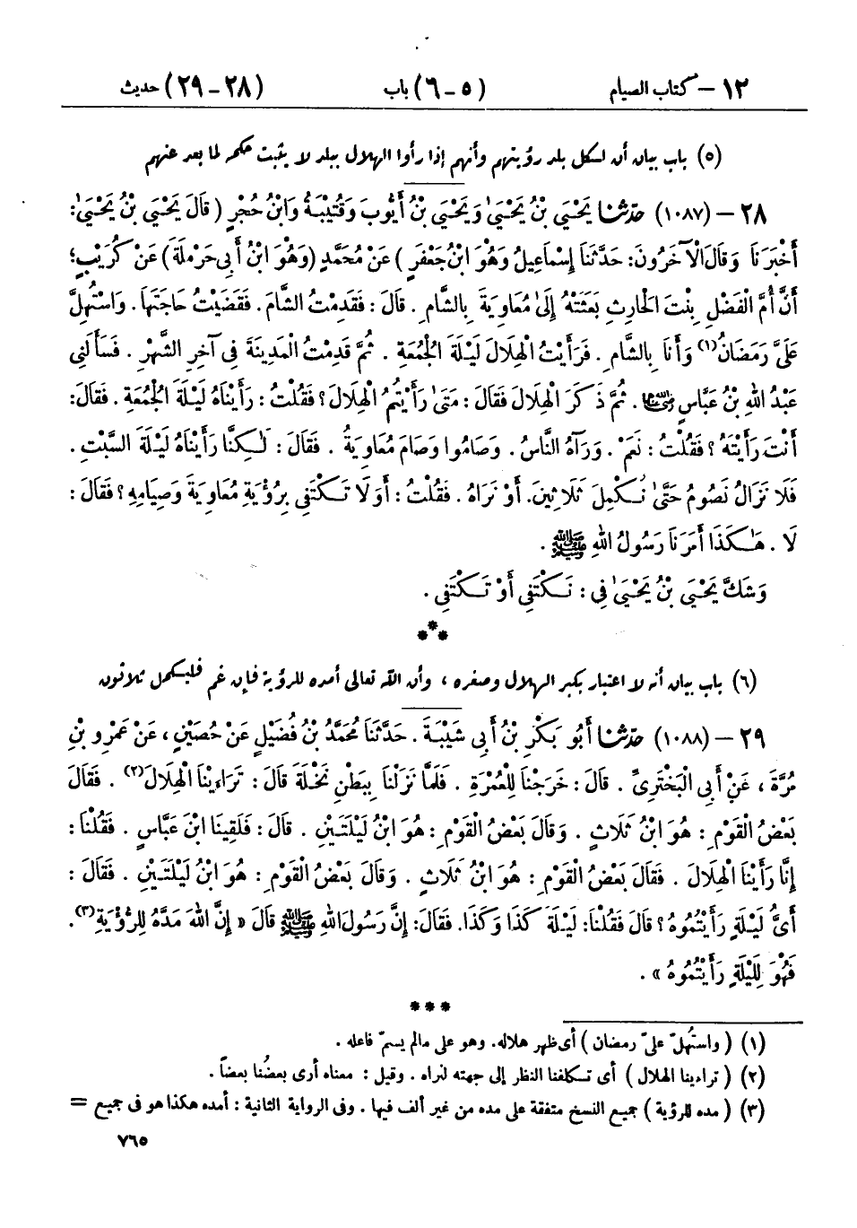 28 - (1087) حَدَّثَنَا يَحْيَى بْنُ يَحْيَى، وَيَحْيَى بْنُ أَيُّوبَ، وَقُتَيْبَةُ، وَابْنُ حُجْرٍ، - قَالَ يَحْيَى بْنُ يَحْيَى: أَخْبَرَنَا، وَقَالَ الْآخَرُونَ: - حَدَّثَنَا إِسْمَاعِيلُ وَهُوَ ابْنُ جَعْفَرٍ، عَنْ مُحَمَّدٍ وَهُوَ ابْنُ أَبِي حَرْمَلَةَ، عَنْ كُرَيْبٍ، أَنَّ أُمَّ الْفَضْلِ بِنْتَ الْحَارِثِ، بَعَثَتْهُ إِلَى مُعَاوِيَةَ بِالشَّامِ، قَالَ: فَقَدِمْتُ الشَّامَ، فَقَضَيْتُ حَاجَتَهَا، وَاسْتُهِلَّ عَلَيَّ رَمَضَانُ وَأَنَا بِالشَّامِ، فَرَأَيْتُ الْهِلَالَ لَيْلَةَ الْجُمُعَةِ، ثُمَّ قَدِمْتُ الْمَدِينَةَ فِي آخِرِ الشَّهْرِ، فَسَأَلَنِي عَبْدُ اللهِ بْنُ عَبَّاسٍ رَضِيَ اللهُ عَنْهُمَا، ثُمَّ ذَكَرَ الْهِلَالَ فَقَالَ: مَتَى رَأَيْتُمُ الْهِلَالَ؟ فَقُلْتُ: رَأَيْنَاهُ لَيْلَةَ الْجُمُعَةِ، فَقَالَ: أَنْتَ رَأَيْتَهُ؟ فَقُلْتُ: نَعَمْ، وَرَآهُ النَّاسُ، وَصَامُوا وَصَامَ مُعَاوِيَةُ، فَقَالَ: " لَكِنَّا رَأَيْنَاهُ لَيْلَةَ السَّبْتِ، فَلَا نَزَالُ نَصُومُ حَتَّى نُكْمِلَ ثَلَاثِينَ، أَوْ نَرَاهُ، فَقُلْتُ: أَوَ لَا تَكْتَفِي بِرُؤْيَةِ مُعَاوِيَةَ وَصِيَامِهِ؟ فَقَالَ: لَا، §هَكَذَا أَمَرَنَا رَسُولُ اللهِ صَلَّى اللهُ عَلَيْهِ وَسَلَّمَ " وَشَكَّ يَحْيَى بْنُ يَحْيَى فِي نَكْتَفِي أَوْ تَكْتَفِي