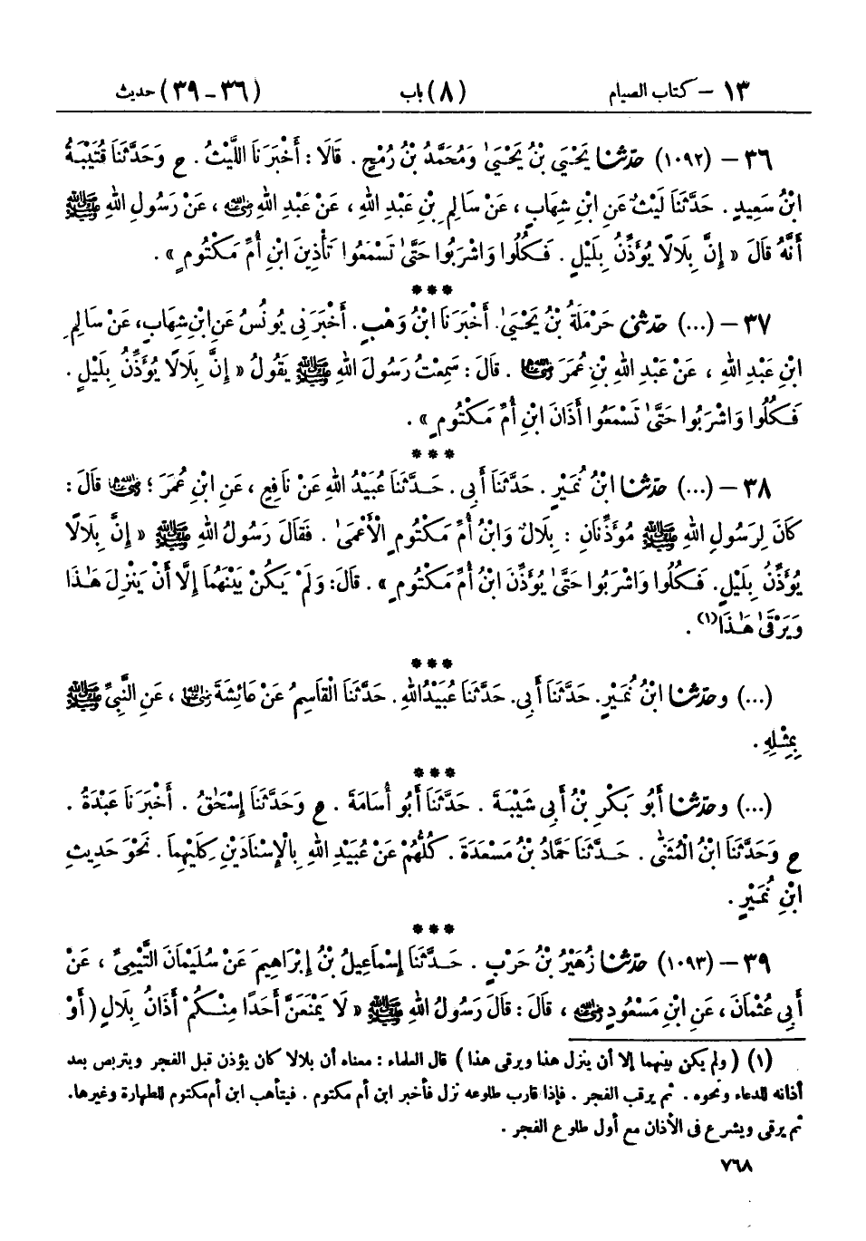 36 - (1092) حَدَّثَنَا يَحْيَى بْنُ يَحْيَى، وَمُحَمَّدُ بْنُ رُمْحٍ، قَالَا: أَخْبَرَنَا اللَّيْثُ، ح وحَدَّثَنَا قُتَيْبَةُ بْنُ سَعِيدٍ، حَدَّثَنَا لَيْثٌ، عَنِ ابْنِ شِهَابٍ، عَنْ سَالِمِ بْنِ عَبْدِ اللهِ، عَنْ عَبْدِ اللهِ رَضِيَ اللهُ عَنْهُ، عَنْ رَسُولِ اللهِ صَلَّى اللهُ عَلَيْهِ وَسَلَّمَ، أَنَّهُ قَالَ: «إِنَّ §بِلَالًا يُؤَذِّنُ بِلَيْلٍ، فَكُلُوا وَاشْرَبُوا حَتَّى تَسْمَعُوا تَأْذِينَ ابْنِ أُمِّ مَكْتُومٍ»
