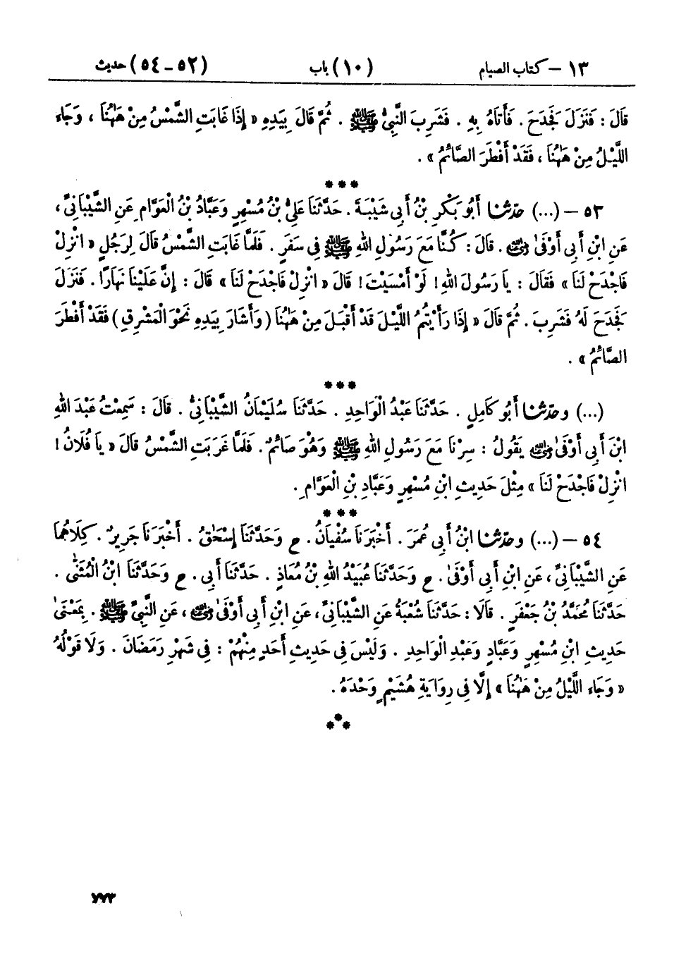 54 - (1101) وحَدَّثَنَا ابْنُ أَبِي عُمَرَ، أَخْبَرَنَا سُفْيَانُ، ح وحَدَّثَنَا إِسْحَاقُ، أَخْبَرَنَا جَرِيرٌ، كِلَاهُمَا عَنِ الشَّيْبَانِيِّ، عَنِ ابْنِ أَبِي أَوْفَى، ح وحَدَّثَنَا عُبَيْدُ اللهِ بْنُ مُعَاذٍ، حَدَّثَنَا أَبِي، ح وحَدَّثَنَا ابْنُ الْمُثَنَّى، حَدَّثَنَا مُحَمَّدُ بْنُ جَعْفَرٍ، قَالَا: حَدَّثَنَا شُعْبَةُ، عَنِ الشَّيْبَانِيِّ، عَنِ ابْنِ أَبِي أَوْفَى رَضِيَ اللهُ عَنْهُ، عَنِ النَّبِيِّ صَلَّى اللهُ عَلَيْهِ وَسَلَّمَ، بِمَعْنَى حَدِيثِ ابْنِ مُسْهِرٍ، وَعَبَّادٍ، وَعَبْدِ الْوَاحِدِ، وَلَيْسَ فِي حَدِيثِ أَحَدٍ مِنْهُمْ: فِي شَهْرِ رَمَضَانَ، وَلَا قَوْلُهُ «وَجَاءَ اللَّيْلُ مِنْ هَا هُنَا» إِلَّا فِي رِوَايَةِ هُشَيْمٍ وَحْدَهُ