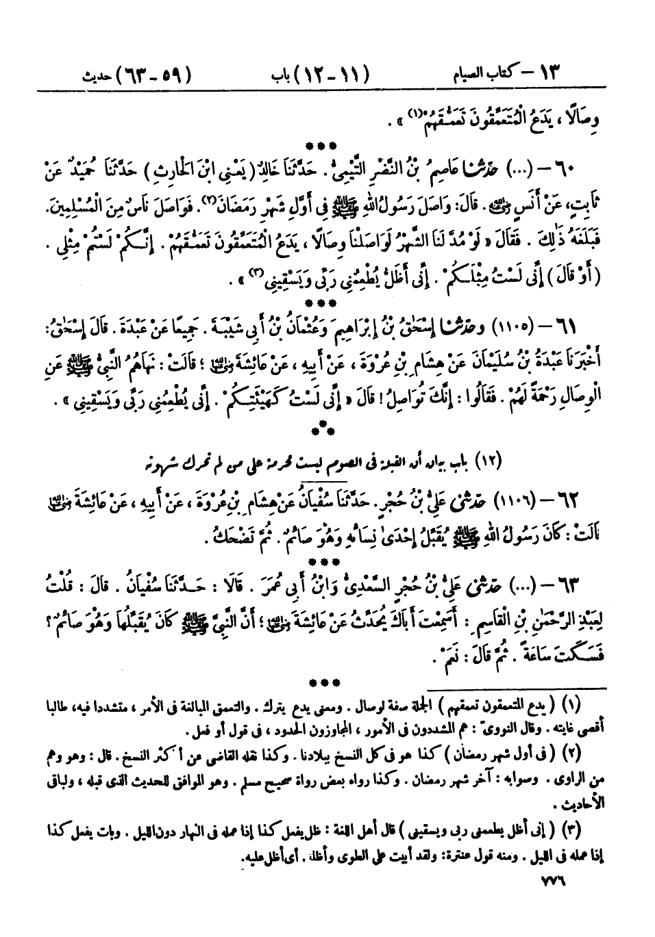 61 - (1105) وحَدَّثَنَا إِسْحَاقُ بْنُ إِبْرَاهِيمَ، وَعُثْمَانُ بْنُ أَبِي شَيْبَةَ، جَمِيعًا عَنْ عَبْدَةَ، قَالَ إِسْحَاقُ: أَخْبَرَنَا عَبْدَةُ بْنُ سُلَيْمَانَ، عَنْ هِشَامِ بْنِ عُرْوَةَ، عَنْ أَبِيهِ، عَنْ عَائِشَةَ رَضِيَ اللهُ عَنْهَا، قَالَتْ: نَهَاهُمُ النَّبِيُّ صَلَّى اللهُ عَلَيْهِ وَسَلَّمَ عَنِ الْوِصَالِ رَحْمَةً لَهُمْ، فَقَالُوا: إِنَّكَ تُوَاصِلُ، قَالَ: «§إِنِّي لَسْتُ كَهَيْئَتِكُمْ، إِنِّي يُطْعِمُنِي رَبِّي وَيَسْقِينِي»