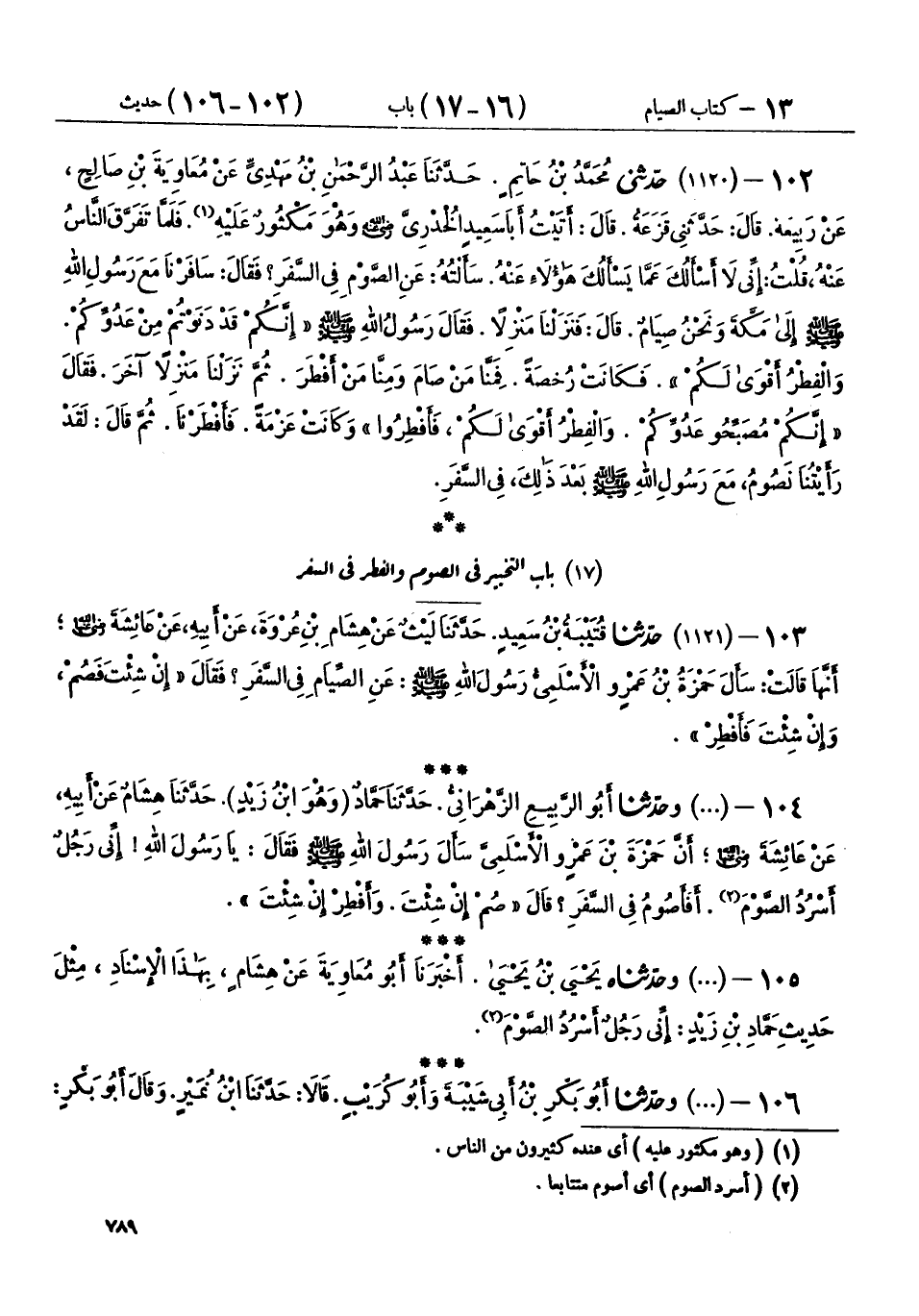 106 - (1121) وحَدَّثَنَا أَبُو بَكْرِ بْنُ أَبِي شَيْبَةَ، وَأَبُو كُرَيْبٍ، قَالَا: حَدَّثَنَا ابْنُ نُمَيْرٍ، وَقَالَ أَبُو بَكْرٍ: حَدَّثَنَا عَبْدُ الرَّحِيمِ بْنُ سُلَيْمَانَ، كِلَاهُمَا عَنْ هِشَامٍ، بِهَذَا الْإِسْنَادِ أَنَّ حَمْزَةَ قَالَ: " إِنِّي رَجُلٌ أَصُومُ، أَفَأَصُومُ فِي السَّفَرِ؟