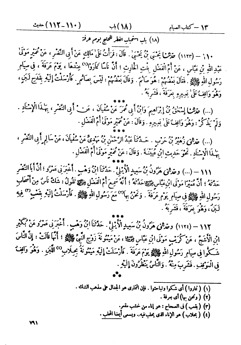 110 - (1123) حَدَّثَنَا يَحْيَى بْنُ يَحْيَى، قَالَ: قَرَأْتُ عَلَى مَالِكٍ، عَنْ أَبِي النَّضْرِ، عَنْ عُمَيْرٍ، مَوْلَى عَبْدِ اللهِ بْنِ عَبَّاسٍ، عَنْ أُمِّ الْفَضْلِ بِنْتِ الْحَارِثِ، " §أَنَّ نَاسًا تَمَارَوْا عِنْدَهَا يَوْمَ عَرَفَةَ، فِي صِيَامِ رَسُولِ اللهِ صَلَّى اللهُ عَلَيْهِ وَسَلَّمَ، فَقَالَ بَعْضُهُمْ: هُوَ صَائِمٌ، وَقَالَ بَعْضُهُمْ: لَيْسَ بِصَائِمٍ، فَأَرْسَلْتُ إِلَيْهِ بِقَدَحِ لَبَنٍ، وَهُوَ وَاقِفٌ عَلَى بَعِيرِهِ بِعَرَفَةَ، فَشَرِبَهُ "