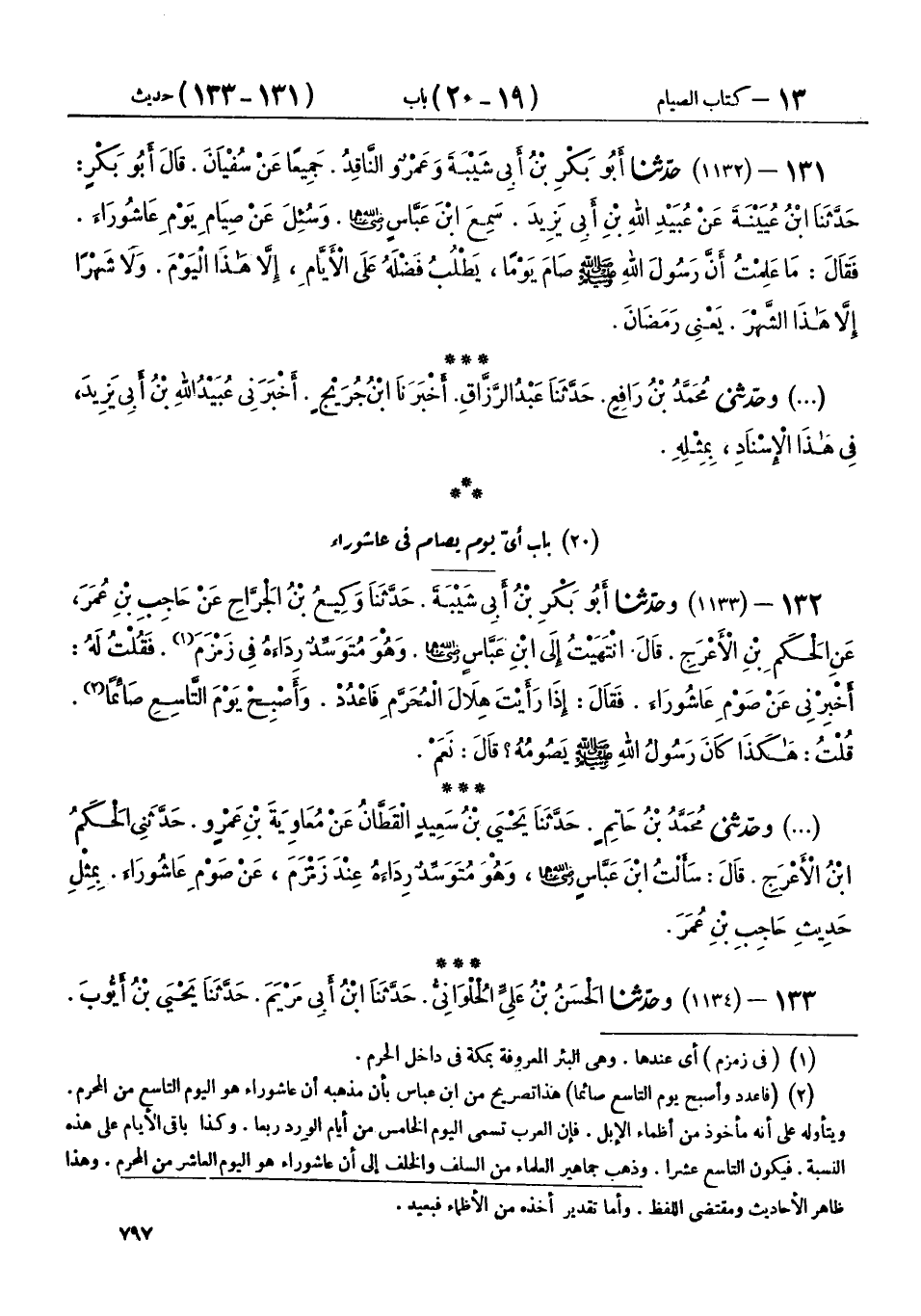 132 - (1133) وحَدَّثَنَا أَبُو بَكْرِ بْنُ أَبِي شَيْبَةَ، حَدَّثَنَا وَكِيعُ بْنُ الْجَرَّاحِ، عَنْ حَاجِبِ بْنِ عُمَرَ، عَنِ الْحَكَمِ بْنِ الْأَعْرَجِ، قَالَ: انْتَهَيْتُ إِلَى ابْنِ عَبَّاسٍ رَضِيَ اللهُ عَنْهُمَا، وَهُوَ مُتَوَسِّدٌ رِدَاءَهُ فِي زَمْزَمَ، فَقُلْتُ لَهُ: أَخْبِرْنِي عَنْ صَوْمِ عَاشُورَاءَ، فَقَالَ: «§إِذَا رَأَيْتَ هِلَالَ الْمُحَرَّمِ فَاعْدُدْ، وَأَصْبِحْ يَوْمَ التَّاسِعِ صَائِمًا»، قُلْتُ: هَكَذَا كَانَ رَسُولُ اللهِ صَلَّى اللهُ عَلَيْهِ وَسَلَّمَ يَصُومُهُ قَالَ: «نَعَمْ»