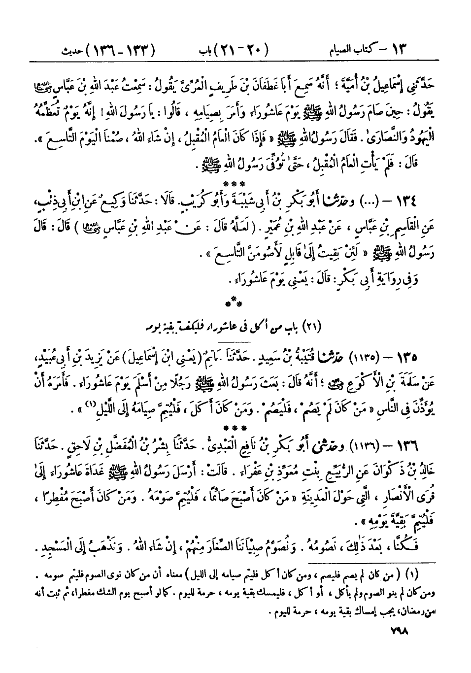 135 - (1135) حَدَّثَنَا قُتَيْبَةُ بْنُ سَعِيدٍ، حَدَّثَنَا حَاتِمٌ يَعْنِي ابْنَ إِسْمَاعِيلَ، عَنْ يَزِيدَ بْنِ أَبِي عُبَيْدٍ، عَنْ سَلَمَةَ بْنِ الْأَكْوَعِ رَضِيَ اللهُ عَنْهُ، أَنَّهُ قَالَ: بَعَثَ رَسُولُ اللهِ صَلَّى اللهُ عَلَيْهِ وَسَلَّمَ رَجُلًا مِنْ أَسْلَمَ يَوْمَ عَاشُورَاءَ، فَأَمَرَهُ أَنْ يُؤَذِّنَ فِي النَّاسِ: «§مَنْ كَانَ لَمْ يَصُمْ، فَلْيَصُمْ وَمَنْ كَانَ أَكَلَ، فَلْيُتِمَّ صِيَامَهُ إِلَى اللَّيْلِ»