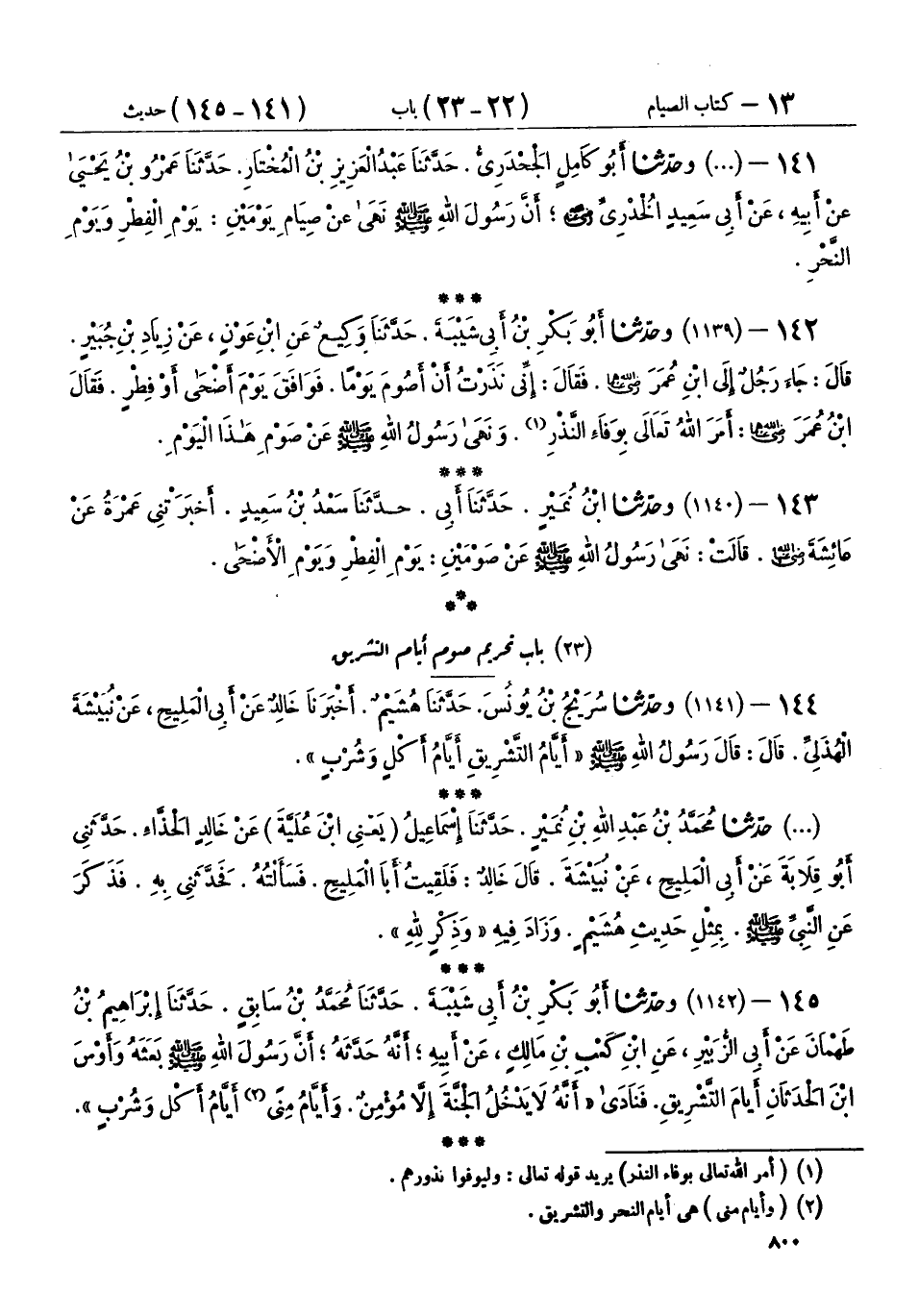 144 - (1141) وحَدَّثَنَا سُرَيْجُ بْنُ يُونُسَ، حَدَّثَنَا هُشَيْمٌ، أَخْبَرَنَا خَالِدٌ، عَنْ أَبِي الْمَلِيحِ، عَنْ نُبَيْشَةَ الْهُذَلِيِّ، قَالَ: قَالَ رَسُولُ اللهِ صَلَّى اللهُ عَلَيْهِ وَسَلَّمَ: «§أَيَّامُ التَّشْرِيقِ أَيَّامُ أَكْلٍ وَشُرْبٍ»