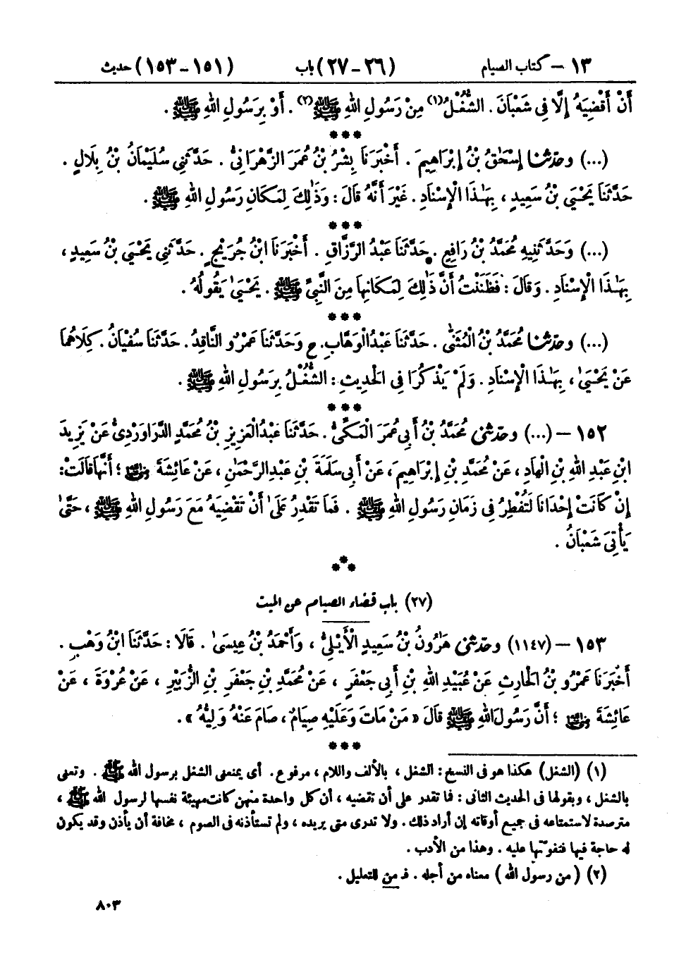 152 - (1146) وحَدَّثَنِي مُحَمَّدُ بْنُ أَبِي عُمَرَ الْمَكِّيُّ، حَدَّثَنَا عَبْدُ الْعَزِيزِ بْنُ مُحَمَّدٍ الدَّرَاوَرْدِيُّ، عَنْ يَزِيدَ بْنِ عَبْدِ اللهِ بْنِ الْهَادِ، عَنْ مُحَمَّدِ بْنِ إِبْرَاهِيمَ، عَنْ أَبِي سَلَمَةَ بْنِ عَبْدِ الرَّحْمَنِ، عَنْ عَائِشَةَ رَضِيَ اللهُ عَنْهَا، أَنَّهَا قَالَتْ: «إِنْ §كَانَتْ إِحْدَانَا لَتُفْطِرُ فِي زَمَانِ رَسُولِ اللهِ صَلَّى اللهُ عَلَيْهِ وَسَلَّمَ، فَمَا تَقْدِرُ عَلَى أَنْ تَقْضِيَهُ مَعَ رَسُولِ اللهِ صَلَّى اللهُ عَلَيْهِ وَسَلَّمَ، حَتَّى يَأْتِيَ شَعْبَانُ»