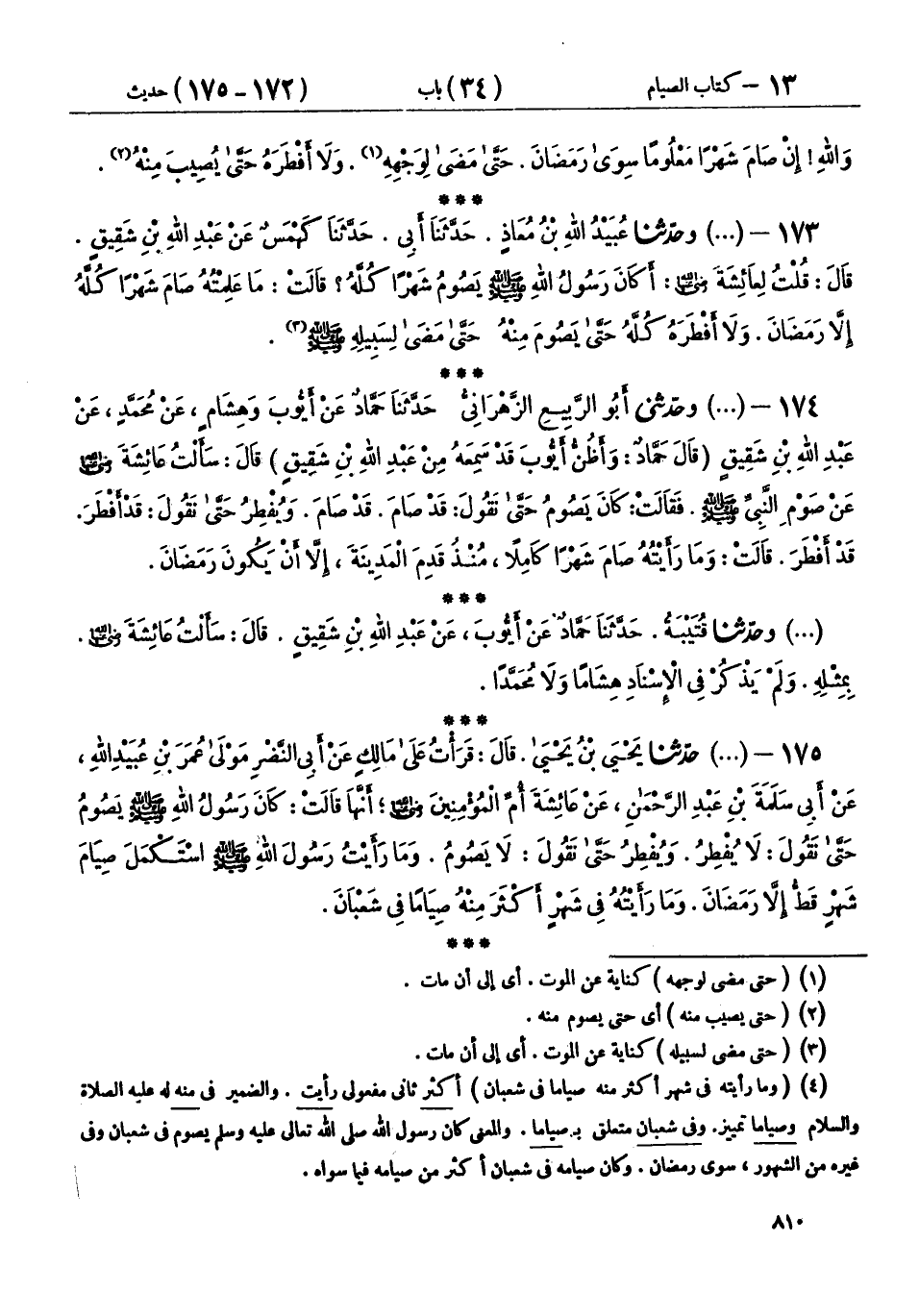 174 - (1156) وحَدَّثَنِي أَبُو الرَّبِيعِ الزَّهْرَانِيُّ، حَدَّثَنَا حَمَّادٌ، عَنْ أَيُّوبَ، وَهِشَامٍ، عَنْ مُحَمَّدٍ، عَنْ عَبْدِ اللهِ بْنِ شَقِيقٍ - قَالَ حَمَّادٌ: وَأَظُنُّ أَيُّوبَ، قَدْ سَمِعَهُ مِنْ عَبْدِ اللهِ بْنِ شَقِيقٍ -، قَالَ: سَأَلْتُ عَائِشَةَ رَضِيَ اللهُ عَنْهَا، عَنْ صَوْمِ النَّبِيِّ صَلَّى اللهُ عَلَيْهِ وَسَلَّمَ، فَقَالَتْ: " كَانَ §يَصُومُ حَتَّى نَقُولَ: قَدْ صَامَ، قَدْ صَامَ، وَيُفْطِرُ حَتَّى نَقُولَ: قَدْ أَفْطَرَ، قَدْ أَفْطَرَ، قَالَتْ: وَمَا رَأَيْتُهُ صَامَ شَهْرًا كَامِلًا، مُنْذُ قَدِمَ الْمَدِينَةَ، إِلَّا أَنْ يَكُونَ رَمَضَانَ "