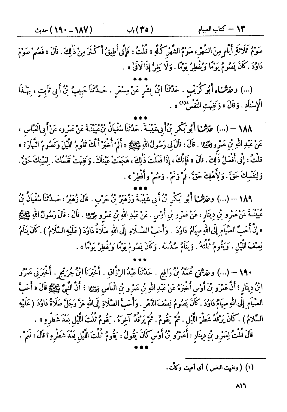 188 - (1159) حَدَّثَنَا أَبُو بَكْرِ بْنُ أَبِي شَيْبَةَ، حَدَّثَنَا سُفْيَانُ بْنُ عُيَيْنَةَ، عَنْ عَمْرٍو، عَنْ أَبِي الْعَبَّاسِ، عَنْ عَبْدِ اللهِ بْنِ عَمْرٍو رَضِيَ اللهُ عَنْهُمَا، قَالَ: قَالَ لِي رَسُولُ اللهِ صَلَّى اللهُ عَلَيْهِ وَسَلَّمَ: «أَلَمْ أُخْبَرْ أَنَّكَ تَقُومُ اللَّيْلَ وَتَصُومُ النَّهَارَ؟» قُلْتُ: إِنِّي أَفْعَلُ ذَلِكَ، قَالَ: «فَإِنَّكَ، إِذَا فَعَلْتَ ذَلِكَ، هَجَمَتْ عَيْنَاكَ، وَنَفِهَتْ نَفْسُكَ، لِعَيْنِكَ حَقٌّ، وَلِنَفْسِكَ حَقٌّ، وَلِأَهْلِكَ حَقٌّ، §قُمْ وَنَمْ، وَصُمْ وَأَفْطِرْ»