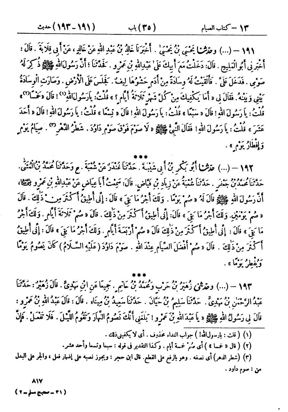 193 - (1159) وحَدَّثَنِي زُهَيْرُ بْنُ حَرْبٍ، وَمُحَمَّدُ بْنُ حَاتِمٍ، جَمِيعًا عَنِ ابْنِ مَهْدِيٍّ، قَالَ زُهَيْرٌ: حَدَّثَنَا عَبْدُ الرَّحْمَنِ بْنُ مَهْدِيٍّ، حَدَّثَنَا سَلِيمُ بْنُ حَيَّانَ، حَدَّثَنَا سَعِيدُ بْنُ مِينَاءَ، قَالَ: قَالَ عَبْدُ اللهِ بْنُ عَمْرٍو: قَالَ لِي رَسُولُ اللهِ صَلَّى اللهُ عَلَيْهِ وَسَلَّمَ: «يَا عَبْدَ اللهِ بْنَ عَمْرٍو، بَلَغَنِي أَنَّكَ تَصُومُ النَّهَارَ وَتَقُومُ اللَّيْلَ، فَلَا تَفْعَلْ، فَإِنَّ لِجَسَدِكَ عَلَيْكَ حَظًّا، وَلِعَيْنِكَ عَلَيْكَ حَظًّا، وَإِنَّ لِزَوْجِكَ عَلَيْكَ حَظًّا، صُمْ وَأَفْطِرْ، صُمْ مِنْ كُلِّ شَهْرٍ ثَلَاثَةَ أَيَّامٍ، فَذَلِكَ صَوْمُ الدَّهْرِ» قُلْتُ: يَا رَسُولَ اللهِ، إِنَّ بِي قُوَّةً، قَالَ: فَصُمْ §صَوْمَ دَاوُدَ عَلَيْهِ السَّلَام، صُمْ يَوْمًا وَأَفْطِرْ يَوْمًا " فَكَانَ يَقُولُ: «يَا لَيْتَنِي أَخَذْتُ بِالرُّخْصَةِ»