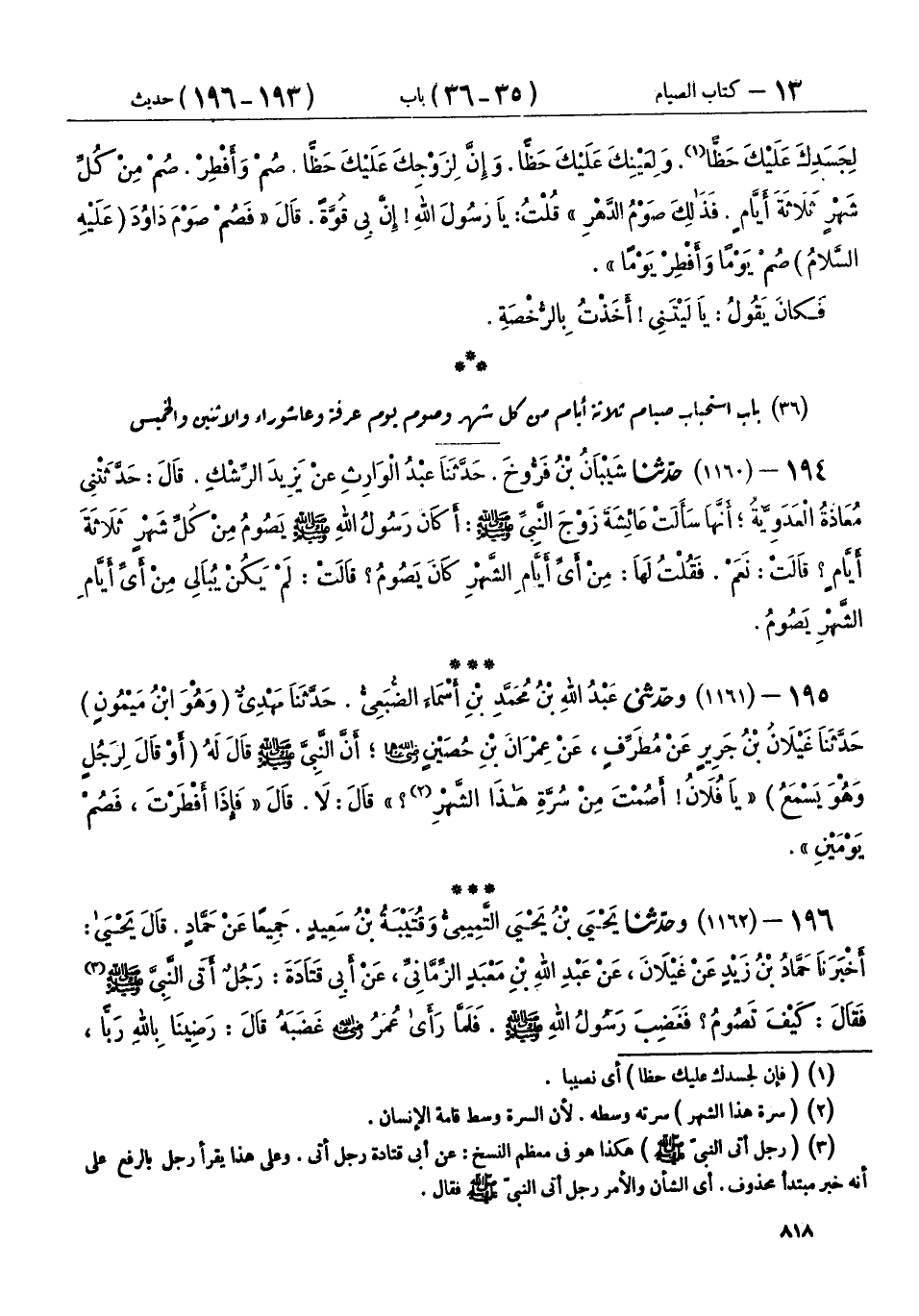 196 - (1162) وحَدَّثَنَا يَحْيَى بْنُ يَحْيَى التَّمِيمِيُّ، وَقُتَيْبَةُ بْنُ سَعِيدٍ، جَمِيعًا عَنْ حَمَّادٍ، قَالَ يَحْيَى: أَخْبَرَنَا حَمَّادُ بْنُ زَيْدٍ، عَنْ غَيْلَانَ، عَنْ عَبْدِ اللهِ بْنِ مَعْبَدٍ الزِّمَّانِيِّ، عَنْ أَبِي قَتَادَةَ: رَجُلٌ أَتَى النَّبِيَّ صَلَّى اللهُ عَلَيْهِ وَسَلَّمَ، فَقَالَ: كَيْفَ تَصُومُ؟ فَغَضِبَ رَسُولُ اللهِ صَلَّى اللهُ عَلَيْهِ وَسَلَّمَ، فَلَمَّا رَأَى عُمَرُ رَضِيَ اللهُ عَنْهُ، غَضَبَهُ، قَالَ: رَضِينَا بِاللهِ رَبًّا، وَبِالْإِسْلَامِ دِينًا، وَبِمُحَمَّدٍ نَبِيًّا، نَعُوذُ بِاللهِ مِنْ غَضَبِ اللهِ وَغَضَبِ رَسُولِهِ، فَجَعَلَ عُمَرُ رَضِيَ اللهُ عَنْهُ يُرَدِّدُ هَذَا الْكَلَامَ حَتَّى سَكَنَ غَضَبُهُ، فَقَالَ عُمَرُ: يَا رَسُولَ اللهِ، كَيْفَ بِمَنْ يَصُومُ الدَّهْرَ كُلَّهُ؟ قَالَ: «لَا صَامَ وَلَا أَفْطَرَ» - أَوْ قَالَ - «لَمْ يَصُمْ وَلَمْ يُفْطِرْ» قَالَ: كَيْفَ مَنْ يَصُومُ يَوْمَيْنِ وَيُفْطِرُ يَوْمًا؟ قَالَ: «وَيُطِيقُ ذَلِكَ أَحَدٌ؟» قَالَ: كَيْفَ مَنْ يَصُومُ يَوْمًا وَيُفْطِرُ يَوْمًا؟ قَالَ: «ذَاكَ صَوْمُ دَاوُدَ عَلَيْهِ السَّلَام» قَالَ: كَيْفَ مَنْ يَصُومُ يَوْمًا وَيُفْطِرُ يَوْمَيْنِ؟ قَالَ: «وَدِدْتُ أَنِّي طُوِّقْتُ ذَلِكَ» ثُمَّ قَالَ رَسُولُ اللهِ صَلَّى اللهُ عَلَيْهِ وَسَلَّمَ: «§ثَلَاثٌ مِنْ كُلِّ شَهْرٍ، وَرَمَضَانُ إِلَى رَمَضَانَ، فَهَذَا صِيَامُ الدَّهْرِ كُلِّهِ، صِيَامُ يَوْمِ عَرَفَةَ، أَحْتَسِبُ عَلَى اللهِ أَنْ يُكَفِّرَ السَّنَةَ الَّتِي قَبْلَهُ، وَالسَّنَةَ الَّتِي بَعْدَهُ، وَصِيَامُ يَوْمِ عَاشُورَاءَ، أَحْتَسِبُ عَلَى اللهِ أَنْ يُكَفِّرَ السَّنَةَ الَّتِي قَبْلَهُ»
