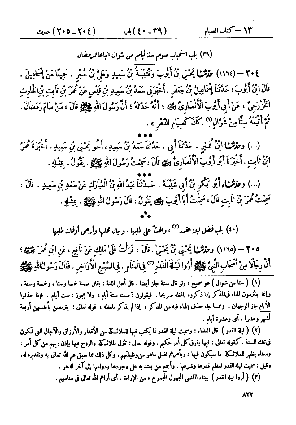 204 - (1164) حَدَّثَنَا يَحْيَى بْنُ أَيُّوبَ، وَقُتَيْبَةُ بْنُ سَعِيدٍ، وَعَلِيُّ بْنُ حُجْرٍ، جَمِيعًا عَنْ إِسْمَاعِيلَ، قَالَ ابْنُ أَيُّوبَ: حَدَّثَنَا إِسْمَاعِيلُ بْنُ جَعْفَرٍ، أَخْبَرَنِي سَعْدُ بْنُ سَعِيدِ بْنِ قَيْسٍ، عَنْ عُمَرَ بْنِ ثَابِتِ بْنِ الْحَارِثِ الْخَزْرَجِيِّ، عَنْ أَبِي أَيُّوبَ الْأَنْصَارِيِّ رَضِيَ اللهُ عَنْهُ، أَنَّهُ حَدَّثَهُ، أَنَّ رَسُولَ اللهِ صَلَّى اللهُ عَلَيْهِ وَسَلَّمَ قَالَ: «§مَنْ صَامَ رَمَضَانَ ثُمَّ أَتْبَعَهُ سِتًّا مِنْ شَوَّالٍ، كَانَ كَصِيَامِ الدَّهْرِ»