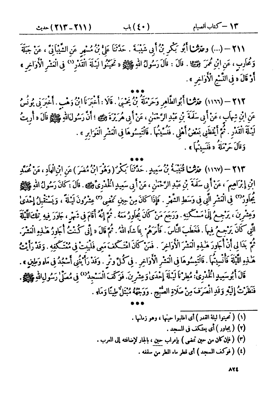 213 - (1167) حَدَّثَنَا قُتَيْبَةُ بْنُ سَعِيدٍ، حَدَّثَنَا بَكْرٌ وَهُوَ ابْنُ مُضَرَ، عَنِ ابْنِ الْهَادِ، عَنْ مُحَمَّدِ بْنِ إِبْرَاهِيمَ، عَنْ أَبِي سَلَمَةَ بْنِ عَبْدِ الرَّحْمَنِ، عَنْ أَبِي سَعِيدٍ الْخُدْرِيِّ رَضِيَ اللهُ عَنْهُ، قَالَ: كَانَ رَسُولُ اللهِ صَلَّى اللهُ عَلَيْهِ وَسَلَّمَ يُجَاوِرُ فِي الْعَشْرِ الَّتِي فِي وَسَطِ الشَّهْرِ، فَإِذَا كَانَ مِنْ حِينِ تَمْضِي عِشْرُونَ لَيْلَةً، وَيَسْتَقْبِلُ إِحْدَى وَعِشْرِينَ يَرْجِعُ إِلَى مَسْكَنِهِ، وَرَجَعَ مَنْ كَانَ يُجَاوِرُ مَعَهُ، ثُمَّ إِنَّهُ أَقَامَ فِي شَهْرٍ، جَاوَرَ فِيهِ تِلْكَ اللَّيْلَةَ الَّتِي كَانَ يَرْجِعُ فِيهَا، فَخَطَبَ النَّاسَ، فَأَمَرَهُمْ بِمَا شَاءَ اللهُ، ثُمَّ قَالَ: «§إِنِّي كُنْتُ أُجَاوِرُ هَذِهِ الْعَشْرَ، ثُمَّ بَدَا لِي أَنْ أُجَاوِرَ هَذِهِ الْعَشْرَ الْأَوَاخِرَ، فَمَنْ كَانَ اعْتَكَفَ مَعِي فَلْيَبِتْ فِي مُعْتَكَفِهِ، وَقَدْ رَأَيْتُ هَذِهِ اللَّيْلَةَ فَأُنْسِيتُهَا، فَالْتَمِسُوهَا فِي الْعَشْرِ الْأَوَاخِرِ، فِي كُلِّ وِتْرٍ، وَقَدْ رَأَيْتُنِي أَسْجُدُ فِي مَاءٍ وَطِينٍ» قَالَ أَبُو سَعِيدٍ الْخُدْرِيُّ: مُطِرْنَا لَيْلَةَ إِحْدَى وَعِشْرِينَ، فَوَكَفَ الْمَسْجِدُ فِي مُصَلَّى رَسُولِ اللهِ صَلَّى اللهُ عَلَيْهِ وَسَلَّمَ، فَنَظَرْتُ إِلَيْهِ وَقَدِ انْصَرَفَ مِنْ صَلَاةِ الصُّبْحِ، وَوَجْهُهُ مُبْتَلٌّ طِينًا وَمَاءً