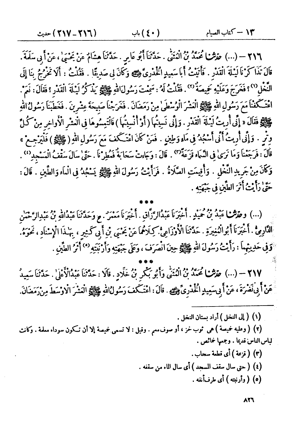 217 - (1167) حَدَّثَنَا مُحَمَّدُ بْنُ الْمُثَنَّى، وَأَبُو بَكْرِ بْنُ خَلَّادٍ، قَالَا: حَدَّثَنَا عَبْدُ الْأَعْلَى، حَدَّثَنَا سَعِيدٌ، عَنْ أَبِي نَضْرَةَ، عَنْ أَبِي سَعِيدٍ الْخُدْرِيِّ رَضِيَ اللهُ عَنْهُ، قَالَ: اعْتَكَفَ رَسُولُ اللهِ صَلَّى اللهُ عَلَيْهِ وَسَلَّمَ الْعَشْرَ الْأَوْسَطَ مِنْ رَمَضَانَ، يَلْتَمِسُ لَيْلَةَ الْقَدْرِ قَبْلَ أَنْ تُبَانَ لَهُ، فَلَمَّا انْقَضَيْنَ أَمَرَ بِالْبِنَاءِ فَقُوِّضَ، ثُمَّ أُبِينَتْ لَهُ أَنَّهَا فِي الْعَشْرِ الْأَوَاخِرِ، فَأَمَرَ بِالْبِنَاءِ فَأُعِيدَ، ثُمَّ خَرَجَ عَلَى النَّاسِ، فَقَالَ: «يَا أَيُّهَا النَّاسُ، إِنَّهَا كَانَتْ §أُبِينَتْ لِي لَيْلَةُ الْقَدْرِ، وَإِنِّي خَرَجْتُ لِأُخْبِرَكُمْ بِهَا، فَجَاءَ رَجُلَانِ يَحْتَقَّانِ مَعَهُمَا الشَّيْطَانُ، فَنُسِّيتُهَا، فَالْتَمِسُوهَا فِي الْعَشْرِ الْأَوَاخِرِ مِنْ رَمَضَانَ، الْتَمِسُوهَا فِي التَّاسِعَةِ وَالسَّابِعَةِ وَالْخَامِسَةِ» قَالَ قُلْتُ: يَا أَبَا سَعِيدٍ، إِنَّكُمْ أَعْلَمُ بِالْعَدَدِ مِنَّا، قَالَ: «أَجَلْ، نَحْنُ أَحَقُّ بِذَلِكَ مِنْكُمْ»، قَالَ قُلْتُ: مَا التَّاسِعَةُ وَالسَّابِعَةُ وَالْخَامِسَةُ؟ قَالَ: «إِذَا مَضَتْ وَاحِدَةٌ وَعِشْرُونَ، فَالَّتِي تَلِيهَا ثِنْتَيْنِ وَعِشْرِينَ وَهِيَ التَّاسِعَةُ، فَإِذَا مَضَتْ ثَلَاثٌ وَعِشْرُونَ، فَالَّتِي تَلِيهَا السَّابِعَةُ، فَإِذَا مَضَى خَمْسٌ وَعِشْرُونَ فَالَّتِي تَلِيهَا الْخَامِسَةُ» - وقَالَ ابْنُ خَلَّادٍ مَكَانَ يَحْتَقَّانِ: يَخْتَصِمَانِ -