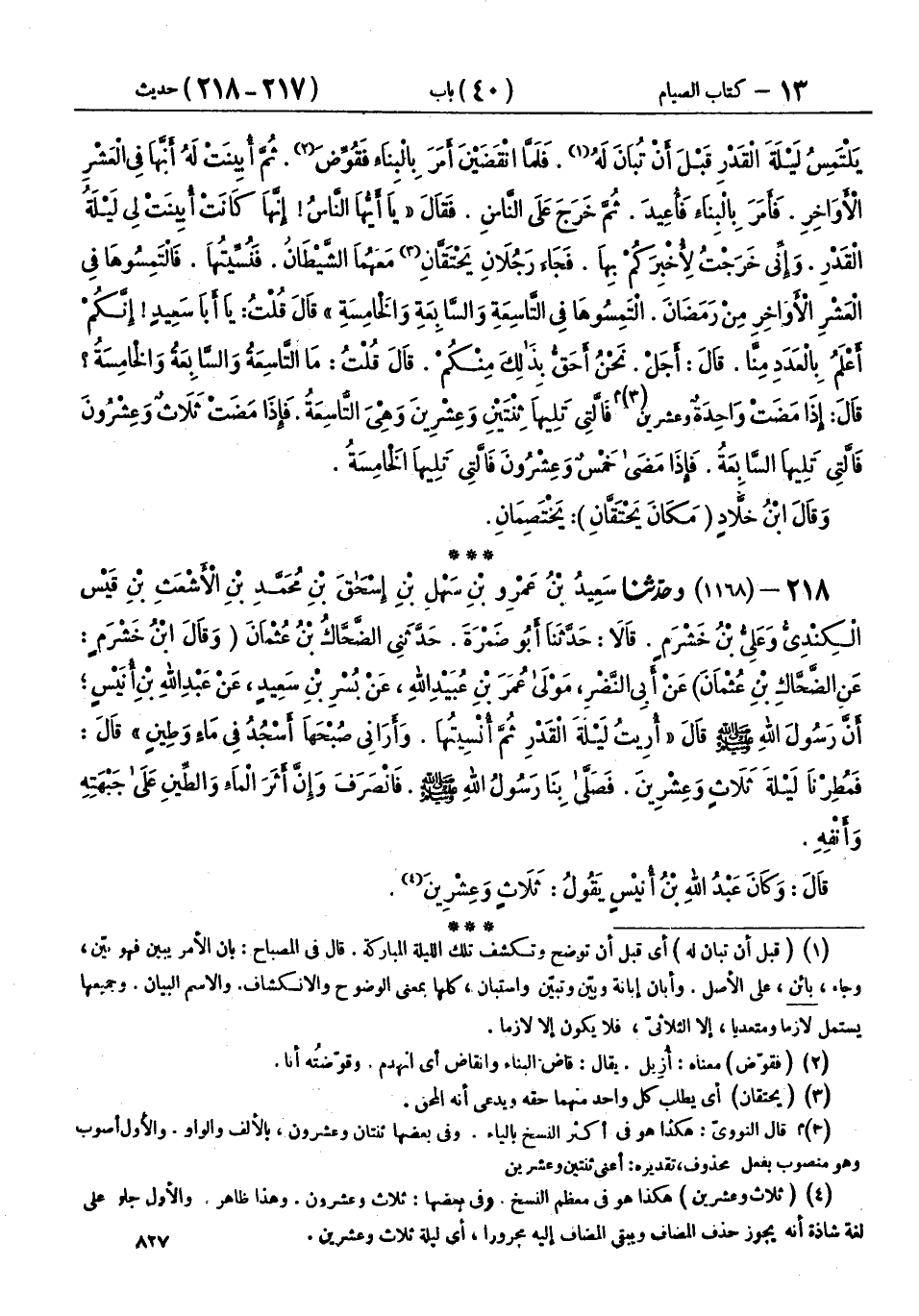 218 - (1168) وحَدَّثَنَا سَعِيدُ بْنُ عَمْرِو بْنِ سَهْلِ بْنِ إِسْحَاقَ بْنِ مُحَمَّدِ بْنِ الْأَشْعَثِ بْنِ قَيْسٍ الْكِنْدِيُّ، وَعَلِيُّ بْنُ خَشْرَمٍ، قَالَا: حَدَّثَنَا أَبُو ضَمْرَةَ، حَدَّثَنِي الضَّحَّاكُ بْنُ عُثْمَانَ - وَقَالَ ابْنُ خَشْرَمٍ: عَنِ الضَّحَّاكِ بْنِ عُثْمَانَ - عَنْ أَبِي النَّضْرِ، مَوْلَى عُمَرَ بْنِ عُبَيْدِ اللهِ، عَنْ بُسْرِ بْنِ سَعِيدٍ، عَنْ عَبْدِ اللهِ بْنِ أُنَيْسٍ، أَنَّ رَسُولَ اللهِ صَلَّى اللهُ عَلَيْهِ وَسَلَّمَ، قَالَ: «§أُرِيتُ لَيْلَةَ الْقَدْرِ، ثُمَّ أُنْسِيتُهَا، وَأَرَانِي صُبْحَهَا أَسْجُدُ فِي مَاءٍ وَطِينٍ» قَالَ: فَمُطِرْنَا لَيْلَةَ ثَلَاثٍ وَعِشْرِينَ، فَصَلَّى بِنَا رَسُولُ اللهِ صَلَّى اللهُ عَلَيْهِ وَسَلَّمَ، فَانْصَرَفَ وَإِنَّ أَثَرَ الْمَاءِ وَالطِّينِ عَلَى جَبْهَتِهِ وَأَنْفِهِ قَالَ: وَكَانَ عَبْدُ اللهِ بْنُ أُنَيْسٍ يَقُولُ: ثَلَاثٍ وَعِشْرِينَ