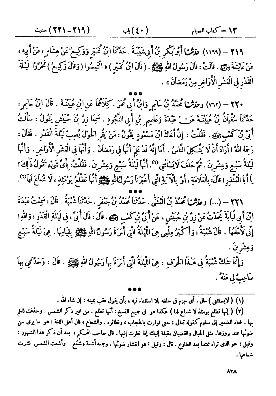 220 - (762) وحَدَّثَنَا مُحَمَّدُ بْنُ حَاتِمٍ، وَابْنُ أَبِي عُمَرَ، كِلَاهُمَا عَنِ ابْنِ عُيَيْنَةَ، قَالَ ابْنُ حَاتِمٍ: حَدَّثَنَا سُفْيَانُ بْنُ عُيَيْنَةَ، عَنْ عَبْدَةَ، وَعَاصِمِ بْنِ أَبِي النَّجُودِ، سَمِعَا زِرَّ بْنَ حُبَيْشٍ، يَقُولُ: سَأَلْتُ أُبَيَّ بْنَ كَعْبٍ رَضِيَ اللهُ عَنْهُ، فَقُلْتُ: إِنَّ أَخَاكَ ابْنَ مَسْعُودٍ يَقُولُ: مَنْ يَقُمِ الْحَوْلَ يُصِبْ لَيْلَةَ الْقَدْرِ؟ فَقَالَ رَحِمَهُ اللهُ: أَرَادَ أَنْ لَا يَتَّكِلَ النَّاسُ، أَمَا إِنَّهُ قَدْ عَلِمَ أَنَّهَا فِي رَمَضَانَ، وَأَنَّهَا فِي الْعَشْرِ الْأَوَاخِرِ، وَأَنَّهَا لَيْلَةُ سَبْعٍ وَعِشْرِينَ، ثُمَّ حَلَفَ لَا يَسْتَثْنِي، أَنَّهَا لَيْلَةُ سَبْعٍ وَعِشْرِينَ، فَقُلْتُ: بِأَيِّ شَيْءٍ تَقُولُ ذَلِكَ؟ يَا أَبَا الْمُنْذِرِ، قَالَ: بِالْعَلَامَةِ، أَوْ بِالْآيَةِ الَّتِي «أَخْبَرَنَا رَسُولُ اللهِ صَلَّى اللهُ عَلَيْهِ وَسَلَّمَ §أَنَّهَا تَطْلُعُ يَوْمَئِذٍ، لَا شُعَاعَ لَهَا»