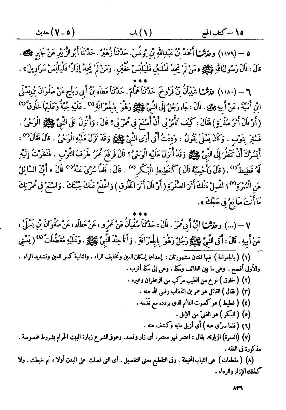6 - (1180) حَدَّثَنَا شَيْبَانُ بْنُ فَرُّوخَ، حَدَّثَنَا هَمَّامٌ، حَدَّثَنَا عَطَاءُ بْنُ أَبِي رَبَاحٍ، عَنْ صَفْوَانَ بْنِ يَعْلَى بْنِ أُمَيَّةَ، عَنْ أَبِيهِ رَضِيَ اللهُ عَنْهُ، قَالَ: جَاءَ رَجُلٌ إِلَى النَّبِيِّ صَلَّى اللهُ عَلَيْهِ وَسَلَّمَ وَهُوَ بِالْجِعْرَانَةِ، عَلَيْهِ جُبَّةٌ وَعَلَيْهَا خَلُوقٌ - أَوْ قَالَ أَثَرُ صُفْرَةٍ - فَقَالَ: كَيْفَ تَأْمُرُنِي أَنْ أَصْنَعَ فِي عُمْرَتِي؟ قَالَ: وَأُنْزِلَ عَلَى النَّبِيِّ صَلَّى اللهُ عَلَيْهِ وَسَلَّمَ الْوَحْيُ، فَسُتِرَ بِثَوْبٍ، وَكَانَ يَعْلَى يَقُولُ: وَدِدْتُ أَنِّي أَرَى النَّبِيَّ صَلَّى اللهُ عَلَيْهِ وَسَلَّمَ وَقَدْ نَزَلَ عَلَيْهِ الْوَحْيُ، قَالَ فَقَالَ: أَيَسُرُّكَ أَنْ تَنْظُرَ إِلَى النَّبِيِّ صَلَّى اللهُ عَلَيْهِ وَسَلَّمَ وَقَدْ أُنْزِلَ عَلَيْهِ الْوَحْيُ؟ قَالَ: فَرَفَعَ عُمَرُ طَرَفَ الثَّوْبِ، فَنَظَرْتُ إِلَيْهِ لَهُ غَطِيطٌ، - قَالَ وَأَحْسَبُهُ قَالَ - كَغَطِيطِ الْبَكْرِ، قَالَ فَلَمَّا سُرِّيَ عَنْهُ قَالَ: «§أَيْنَ السَّائِلُ عَنِ الْعُمْرَةِ؟ اغْسِلْ عَنْكَ أَثَرَ الصُّفْرَةِ - أَوْ قَالَ أَثَرَ الْخَلُوقِ - وَاخْلَعْ عَنْكَ جُبَّتَكَ، وَاصْنَعْ فِي عُمْرَتِكَ مَا أَنْتَ صَانِعٌ فِي حَجِّكَ»