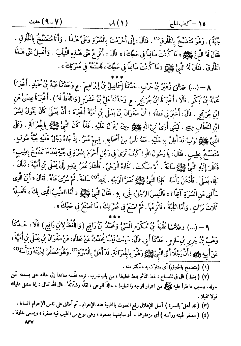 8 - (1180) حَدَّثَنِي زُهَيْرُ بْنُ حَرْبٍ، حَدَّثَنَا إِسْمَاعِيلُ بْنُ إِبْرَاهِيمَ، ح وحَدَّثَنَا عَبْدُ بْنُ حُمَيْدٍ، أَخْبَرَنَا مُحَمَّدُ بْنُ بَكْرٍ، قَالَا: أَخْبَرَنَا ابْنُ جُرَيْجٍ، ح وحَدَّثَنَا عَلِيُّ بْنُ خَشْرَمٍ - وَاللَّفْظُ لَهُ - أَخْبَرَنَا عِيسَى، عَنِ ابْنِ جُرَيْجٍ، قَالَ: أَخْبَرَنِي عَطَاءٌ، أَنَّ صَفْوَانَ بْنَ يَعْلَى بْنِ أُمَيَّةَ، أَخْبَرَهُ أَنَّ يَعْلَى كَانَ يَقُولُ لِعُمَرَ بْنِ الْخَطَّابِ رَضِيَ اللهُ عَنْهُ: لَيْتَنِي أَرَى نَبِيَّ اللهِ صَلَّى اللهُ عَلَيْهِ وَسَلَّمَ حِينَ يُنْزَلُ عَلَيْهِ، فَلَمَّا كَانَ النَّبِيُّ صَلَّى اللهُ عَلَيْهِ وَسَلَّمَ بِالْجِعْرَانَةِ، وَعَلَى النَّبِيِّ صَلَّى اللهُ عَلَيْهِ وَسَلَّمَ ثَوْبٌ قَدْ أُظِلَّ بِهِ عَلَيْهِ، مَعَهُ نَاسٌ مِنْ أَصْحَابِهِ، فِيهِمْ عُمَرُ، إِذْ جَاءَهُ رَجُلٌ عَلَيْهِ جُبَّةُ صُوفٍ، مُتَضَمِّخٌ بِطِيبٍ، فَقَالَ: يَا رَسُولَ اللهِ، كَيْفَ تَرَى فِي رَجُلٍ أَحْرَمَ بِعُمْرَةٍ فِي جُبَّةٍ بَعْدَمَا تَضَمَّخَ بِطِيبٍ؟ فَنَظَرَ إِلَيْهِ النَّبِيُّ صَلَّى اللهُ عَلَيْهِ وَسَلَّمَ سَاعَةً، ثُمَّ سَكَتَ، فَجَاءَهُ الْوَحْيُ، فَأَشَارَ عُمَرُ بِيَدِهِ إِلَى يَعْلَى بْنِ أُمَيَّةَ: تَعَالَ، فَجَاءَ يَعْلَى، فَأَدْخَلَ رَأْسَهُ، فَإِذَا النَّبِيُّ صَلَّى اللهُ عَلَيْهِ وَسَلَّمَ مُحْمَرُّ الْوَجْهِ، يَغِطُّ سَاعَةً، ثُمَّ سُرِّيَ عَنْهُ، فَقَالَ: «أَيْنَ الَّذِي سَأَلَنِي عَنِ الْعُمْرَةِ آنِفًا؟» فَالْتُمِسَ الرَّجُلُ، فَجِيءَ بِهِ، فَقَالَ النَّبِيُّ صَلَّى اللهُ عَلَيْهِ وَسَلَّمَ: «§أَمَّا الطِّيبُ الَّذِي بِكَ، فَاغْسِلْهُ ثَلَاثَ مَرَّاتٍ، وَأَمَّا الْجُبَّةُ فَانْزِعْهَا، ثُمَّ اصْنَعْ فِي عُمْرَتِكَ، مَا تَصْنَعُ فِي حَجِّكَ»