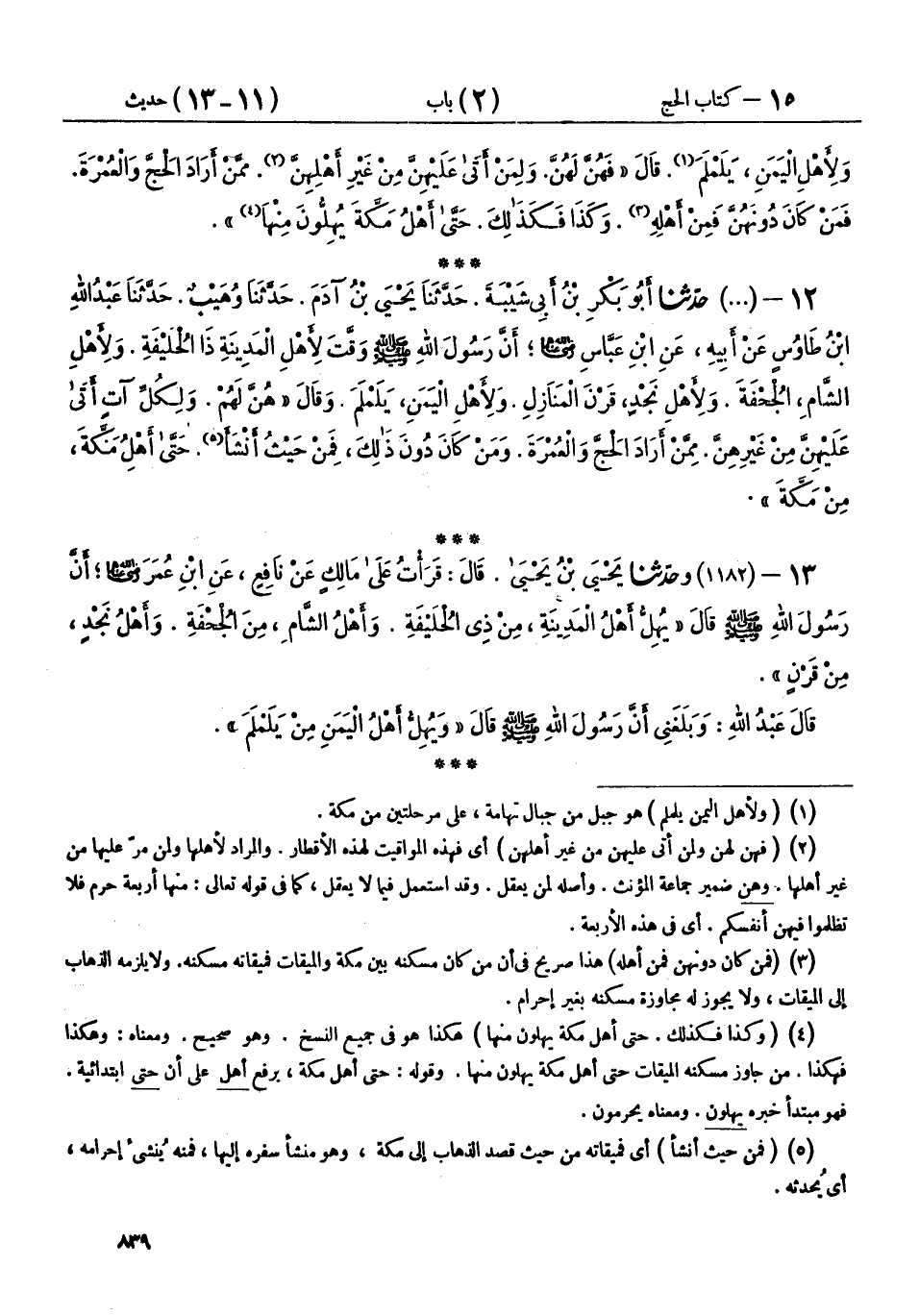 13 - (1182) وحَدَّثَنَا يَحْيَى بْنُ يَحْيَى، قَالَ: قَرَأْتُ عَلَى مَالِكٍ، عَنْ نَافِعٍ، عَنِ ابْنِ عُمَرَ رَضِيَ اللهُ عَنْهُمَا، أَنَّ رَسُولَ اللهِ صَلَّى اللهُ عَلَيْهِ وَسَلَّمَ قَالَ: «§يُهِلُّ أَهْلُ الْمَدِينَةِ، مِنْ ذِي الْحُلَيْفَةِ، وَأَهْلُ الشَّامِ، مِنَ الْجُحْفَةِ، وَأَهْلُ نَجْدٍ، مِنْ قَرْنٍ» قَالَ عَبْدُ اللهِ: وَبَلَغَنِي أَنَّ رَسُولَ اللهِ صَلَّى اللهُ عَلَيْهِ وَسَلَّمَ، قَالَ: «وَيُهِلُّ أَهْلُ الْيَمَنِ مِنْ يَلَمْلَمَ»