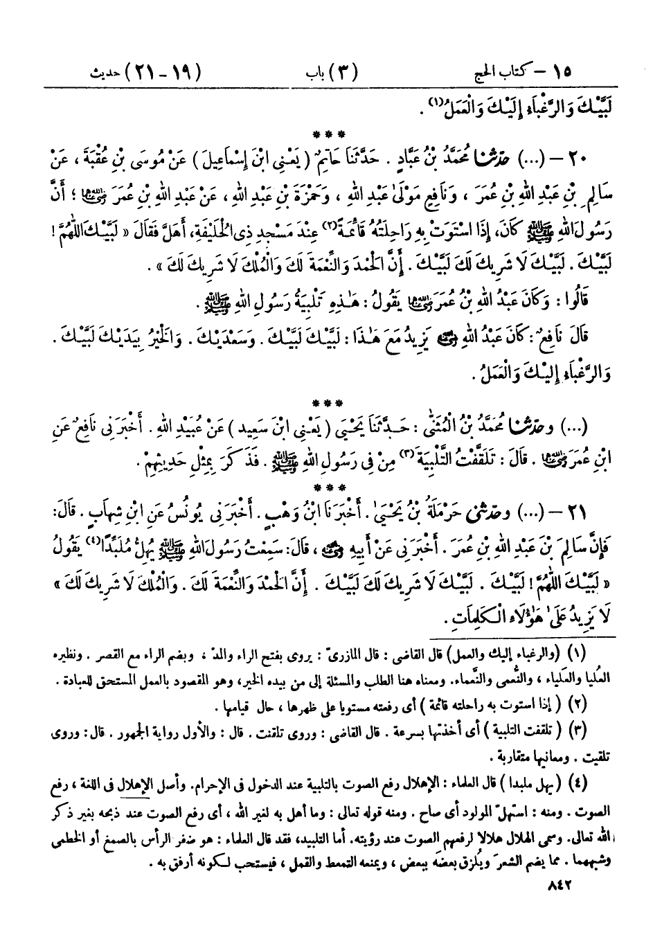 20 - (1184) حَدَّثَنَا مُحَمَّدُ بْنُ عَبَّادٍ، حَدَّثَنَا حَاتِمٌ يَعْنِي ابْنَ إِسْمَاعِيلَ، عَنْ مُوسَى بْنِ عُقْبَةَ، عَنْ سَالِمِ بْنِ عَبْدِ اللهِ بْنِ عُمَرَ، وَنَافِعٍ، مَوْلَى عَبْدِ اللهِ، وَحَمْزَةَ بْنِ عَبْدِ اللهِ، عَنْ عَبْدِ اللهِ بْنِ عُمَرَ رَضِيَ اللهُ عَنْهُمَا، أَنَّ رَسُولَ اللهِ صَلَّى اللهُ عَلَيْهِ وَسَلَّمَ كَانَ، إِذَا اسْتَوَتْ بِهِ رَاحِلَتُهُ قَائِمَةً عِنْدَ مَسْجِدِ ذِي الْحُلَيْفَةِ، أَهَلَّ فَقَالَ: «§لَبَّيْكَ اللهُمَّ، لَبَّيْكَ، لَبَّيْكَ لَا شَرِيكَ لَكَ لَبَّيْكَ، إِنَّ الْحَمْدَ، وَالنِّعْمَةَ، لَكَ وَالْمُلْكَ، لَا شَرِيكَ لَكَ» قَالُوا: وَكَانَ عَبْدُ اللهِ بْنُ عُمَرَ رَضِيَ اللهُ عَنْهُمَا، يَقُولُ: هَذِهِ تَلْبِيَةُ رَسُولِ اللهِ صَلَّى اللهُ عَلَيْهِ وَسَلَّمَ قَالَ نَافِعٌ: كَانَ عَبْدُ اللهِ رَضِيَ اللهُ عَنْهُ يَزِيدُ مَعَ هَذَا: «لَبَّيْكَ لَبَّيْكَ، وَسَعْدَيْكَ، وَالْخَيْرُ بِيَدَيْكَ لَبَّيْكَ، وَالرَّغْبَاءُ إِلَيْكَ وَالْعَمَلُ»
