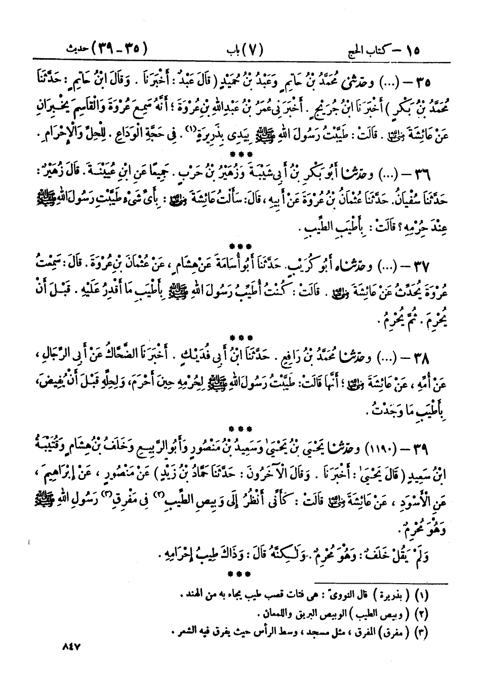 39 - (1190) وحَدَّثَنَا يَحْيَى بْنُ يَحْيَى، وَسَعِيدُ بْنُ مَنْصُورٍ، وَأَبُو الرَّبِيعِ، وَخَلَفُ بْنُ هِشَامٍ، وَقُتَيْبَةُ بْنُ سَعِيدٍ - قَالَ يَحْيَى: أَخْبَرَنَا، وقَالَ الْآخَرُونَ: - حَدَّثَنَا حَمَّادُ بْنُ زَيْدٍ، عَنْ مَنْصُورٍ، عَنْ إِبْرَاهِيمَ، عَنِ الْأَسْوَدِ، عَنْ عَائِشَةَ رَضِيَ اللهُ عَنْهَا، قَالَتْ: «§كَأَنِّي أَنْظُرُ إِلَى وَبِيصِ الطِّيبِ فِي مَفْرِقِ رَسُولِ اللهِ صَلَّى اللهُ عَلَيْهِ وَسَلَّمَ وَهُوَ مُحْرِمٌ»، وَلَمْ يَقُلْ خَلَفٌ: وَهُوَ مُحْرِمٌ، وَلَكِنَّهُ قَالَ: وَذَاكَ طِيبُ إِحْرَامِهِ
