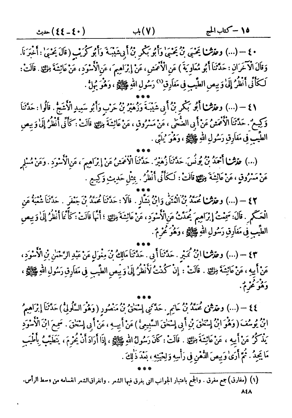 40 - (1190) وحَدَّثَنَا يَحْيَى بْنُ يَحْيَى، وَأَبُو بَكْرِ بْنُ أَبِي شَيْبَةَ وَأَبُو كُرَيْبٍ - قَالَ يَحْيَى: أَخْبَرَنَا، وقَالَ الْآخَرَانِ: - حَدَّثَنَا أَبُو مُعَاوِيَةَ، عَنِ الْأَعْمَشِ، عَنْ إِبْرَاهِيمَ، عَنِ الْأَسْوَدِ، عَنْ عَائِشَةَ رَضِيَ اللهُ عَنْهَا، قَالَتْ: «§لَكَأَنِّي أَنْظُرُ إِلَى وَبِيصِ الطِّيبِ فِي مَفَارِقِ رَسُولِ اللهِ صَلَّى اللهُ عَلَيْهِ وَسَلَّمَ، وَهُوَ يُهِلُّ»