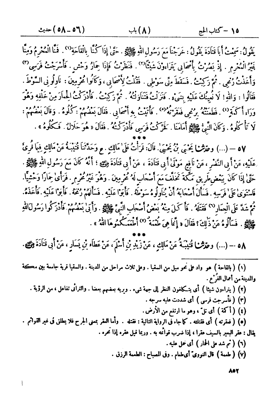 57 - (1196) وحَدَّثَنَا يَحْيَى بْنُ يَحْيَى، قَالَ: قَرَأْتُ عَلَى مَالِكٍ، ح وحَدَّثَنَا قُتَيْبَةُ، عَنْ مَالِكٍ، فِيمَا قُرِئَ عَلَيْهِ عَنْ أَبِي النَّضْرِ، عَنْ نَافِعٍ مَوْلَى أَبِي قَتَادَةَ، عَنْ أَبِي قَتَادَةَ رَضِيَ اللهُ عَنْهُ، أَنَّهُ كَانَ مَعَ رَسُولِ اللهِ صَلَّى اللهُ عَلَيْهِ وَسَلَّمَ، حَتَّى إِذَا كَانَ بِبَعْضِ طَرِيقِ مَكَّةَ تَخَلَّفَ مَعَ أَصْحَابٍ لَهُ مُحْرِمِينَ، وَهُوَ غَيْرُ مُحْرِمٍ فَرَأَى حِمَارًا وَحْشِيًّا، فَاسْتَوَى عَلَى فَرَسِهِ، فَسَأَلَ أَصْحَابَهُ أَنْ يُنَاوِلُوهُ سَوْطَهُ فَأَبَوْا عَلَيْهِ، فَسَأَلَهُمْ رُمْحَهُ فَأَبَوْا عَلَيْهِ، فَأَخَذَهُ ثُمَّ شَدَّ عَلَى الْحِمَارِ فَقَتَلَهُ، فَأَكَلَ مِنْهُ بَعْضُ أَصْحَابِ النَّبِيِّ صَلَّى اللهُ عَلَيْهِ وَسَلَّمَ وَأَبَى بَعْضُهُمْ، فَأَدْرَكُوا رَسُولَ اللهِ صَلَّى اللهُ عَلَيْهِ وَسَلَّمَ، فَسَأَلُوهُ عَنْ ذَلِكَ، فَقَالَ: «§إِنَّمَا هِيَ طُعْمَةٌ أَطْعَمَكُمُوهَا اللهُ»