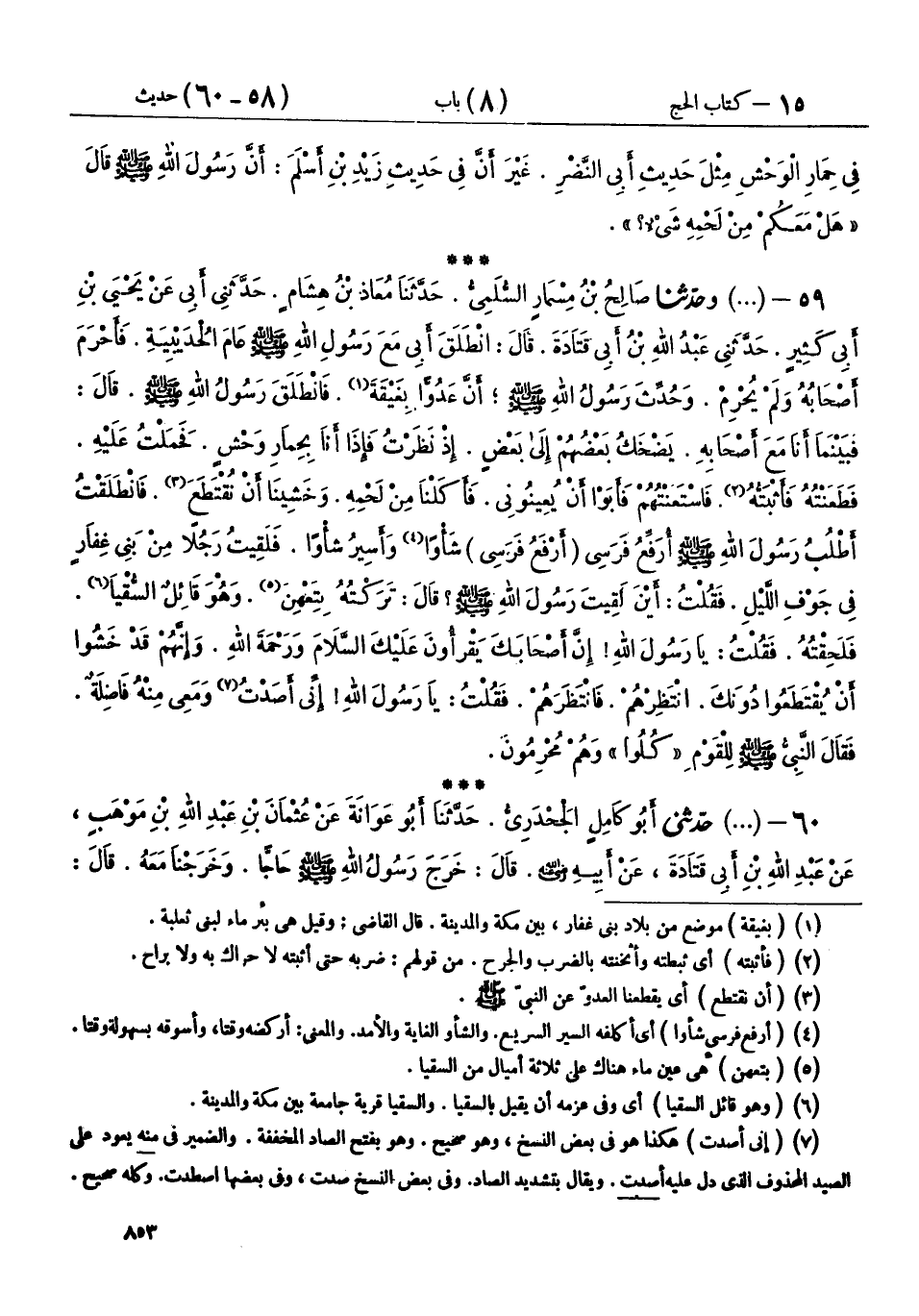 59 - (1196) وحَدَّثَنَا صَالِحُ بْنُ مِسْمَارٍ السُّلَمِيُّ، حَدَّثَنَا مُعَاذُ بْنُ هِشَامٍ، حَدَّثَنِي أَبِي، عَنْ يَحْيَى بْنِ أَبِي كَثِيرٍ، حَدَّثَنِي عَبْدُ اللهِ بْنُ أَبِي قَتَادَةَ، قَالَ: انْطَلَقَ أَبِي مَعَ رَسُولِ اللهِ صَلَّى اللهُ عَلَيْهِ وَسَلَّمَ عَامَ الْحُدَيْبِيَةِ، فَأَحْرَمَ أَصْحَابُهُ وَلَمْ يُحْرِمْ، وَحُدِّثَ رَسُولُ اللهِ صَلَّى اللهُ عَلَيْهِ وَسَلَّمَ، أَنَّ عَدُوًّا بِغَيْقَةَ، فَانْطَلَقَ رَسُولُ اللهِ صَلَّى اللهُ عَلَيْهِ وَسَلَّمَ، قَالَ: فَبَيْنَمَا أَنَا مَعَ أَصْحَابِهِ، يَضْحَكُ بَعْضُهُمْ إِلَى بَعْضٍ، إِذْ نَظَرْتُ فَإِذَا أَنَا بِحِمَارِ وَحْشٍ، فَحَمَلْتُ عَلَيْهِ، فَطَعَنْتُهُ فَأَثْبَتُّهُ، فَاسْتَعَنْتُهُمْ فَأَبَوْا أَنْ يُعِينُونِي، فَأَكَلْنَا مِنْ لَحْمِهِ، وَخَشِينَا أَنْ نُقْتَطَعَ، فَانْطَلَقْتُ أَطْلُبُ رَسُولَ اللهِ صَلَّى اللهُ عَلَيْهِ وَسَلَّمَ أَرْفَعُ فَرَسِي شَأْوًا وَأَسِيرُ شَأْوًا، فَلَقِيتُ رَجُلًا مِنْ بَنِي غِفَارٍ فِي جَوْفِ اللَّيْلِ، فَقُلْتُ: أَيْنَ لَقِيتَ رَسُولَ اللهِ صَلَّى اللهُ عَلَيْهِ وَسَلَّمَ؟ قَالَ: تَرَكْتُهُ بِتَعْهِنَ وَهُوَ قَائِلٌ السُّقْيَا، فَلَحِقْتُهُ، فَقُلْتُ: يَا رَسُولَ اللهِ، إِنَّ أَصْحَابَكَ يَقْرَءُونَ عَلَيْكَ السَّلَامَ وَرَحْمَةَ اللهِ، وَإِنَّهُمْ قَدْ خَشُوا أَنْ يُقْتَطَعُوا دُونَكَ، انْتَظِرْهُمْ، فَانْتَظَرَهُمْ، فَقُلْتُ: يَا رَسُولَ اللهِ، إِنِّي أَصَدْتُ وَمَعِي مِنْهُ فَاضِلَةٌ، فَقَالَ النَّبِيُّ صَلَّى اللهُ عَلَيْهِ وَسَلَّمَ: لِلْقَوْمِ: «§كُلُوا» وَهُمْ مُحْرِمُونَ