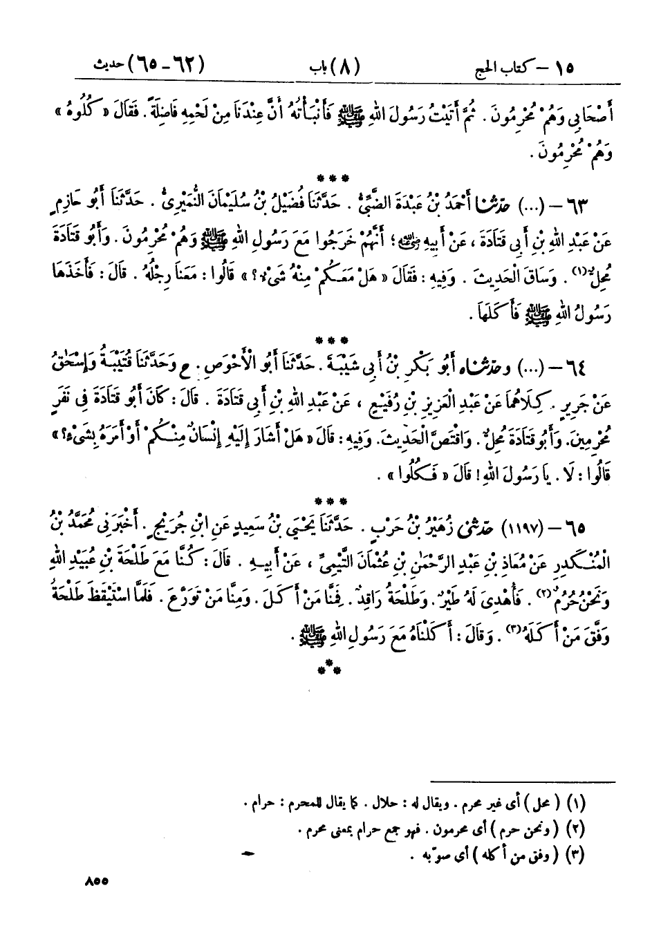 64 - (1196) وحَدَّثَنَاه أَبُو بَكْرِ بْنُ أَبِي شَيْبَةَ، حَدَّثَنَا أَبُو الْأَحْوَصِ، ح وحَدَّثَنَا قُتَيْبَةُ، وَإِسْحَاقُ، عَنْ جَرِيرٍ، كِلَاهُمَا عَنْ عَبْدِ الْعَزِيزِ بْنِ رُفَيْعٍ، عَنْ عَبْدِ اللهِ بْنِ أَبِي قَتَادَةَ، قَالَ: كَانَ أَبُو قَتَادَةَ فِي نَفَرٍ مُحْرِمِينَ، وَأَبُو قَتَادَةَ مُحِلٌّ، وَاقْتَصَّ الْحَدِيثَ، وَفِيهِ: قَالَ: «هَلْ أَشَارَ إِلَيْهِ إِنْسَانٌ مِنْكُمْ أَوْ أَمَرَهُ بِشَيْءٍ؟» قَالُوا: لَا، يَا رَسُولَ اللهِ، قَالَ: «فَكُلُوا»