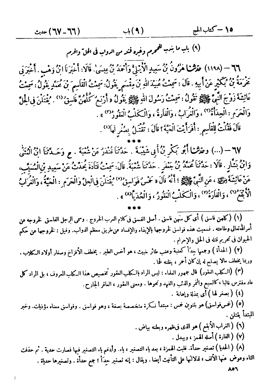66 - (1198) حَدَّثَنَا هَارُونُ بْنُ سَعِيدٍ الْأَيْلِيُّ، وَأَحْمَدُ بْنُ عِيسَى، قَالَا: أَخْبَرَنَا ابْنُ وَهْبٍ، أَخْبَرَنِي مَخْرَمَةُ بْنُ بُكَيْرٍ، عَنْ أَبِيهِ، قَالَ: سَمِعْتُ عُبَيْدَ اللهِ بْنَ مِقْسَمٍ، يَقُولُ: سَمِعْتُ الْقَاسِمَ بْنَ مُحَمَّدٍ، يَقُولُ: سَمِعْتُ عَائِشَةَ، زَوْجَ النَّبِيِّ صَلَّى اللهُ عَلَيْهِ وَسَلَّمَ تَقُولُ: سَمِعْتُ رَسُولَ اللهِ صَلَّى اللهُ عَلَيْهِ وَسَلَّمَ، يَقُولُ: " §أَرْبَعٌ كُلُّهُنَّ فَاسِقٌ، يُقْتَلْنَ فِي الْحِلِّ وَالْحَرَمِ: الْحِدَأَةُ، وَالْغُرَابُ، وَالْفَأْرَةُ، وَالْكَلْبُ الْعَقُورُ " قَالَ: فَقُلْتُ لِلْقَاسِمِ: أَفَرَأَيْتَ الْحَيَّةَ؟ قَالَ: «تُقْتَلُ بِصُغْرٍ لَهَا»