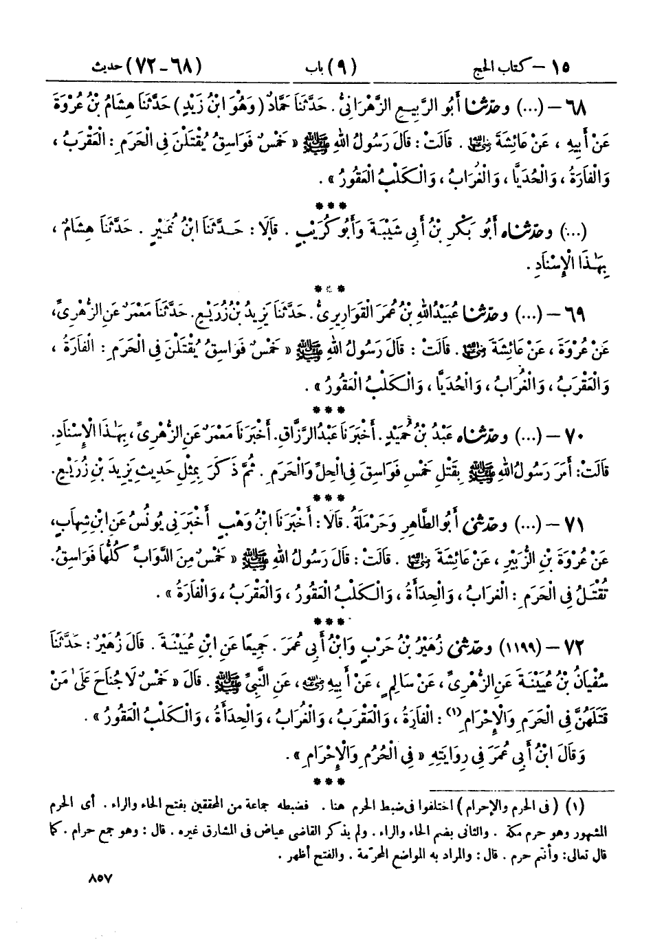 72 - (1199) وحَدَّثَنِي زُهَيْرُ بْنُ حَرْبٍ، وَابْنُ أَبِي عُمَرَ، جَمِيعًا عَنِ ابْنِ عُيَيْنَةَ، قَالَ زُهَيْرٌ: حَدَّثَنَا سُفْيَانُ بْنُ عُيَيْنَةَ، عَنِ الزُّهْرِيِّ، عَنْ سَالِمٍ، عَنْ أَبِيهِ رَضِيَ اللهُ عَنْهُ، عَنِ النَّبِيِّ صَلَّى اللهُ عَلَيْهِ وَسَلَّمَ قَالَ: " §خَمْسٌ لَا جُنَاحَ عَلَى مَنْ قَتَلَهُنَّ فِي الْحَرَمِ وَالْإِحْرَامِ: الْفَأْرَةُ، وَالْعَقْرَبُ، وَالْغُرَابُ، وَالْحِدَأَةُ وَالْكَلْبُ الْعَقُورُ " وقَالَ ابْنُ أَبِي عُمَرَ فِي رِوَايَتِهِ: «فِي الْحُرُمِ وَالْإِحْرَامِ»