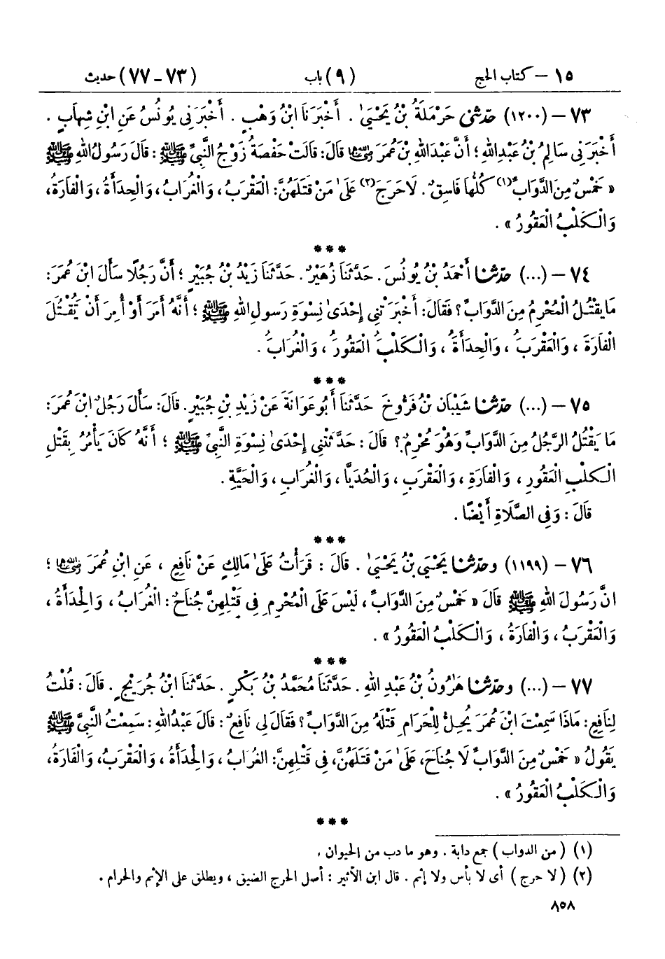 76 - (1199) وحَدَّثَنَا يَحْيَى بْنُ يَحْيَى، قَالَ: قَرَأْتُ عَلَى مَالِكٍ، عَنْ نَافِعٍ، عَنِ ابْنِ عُمَرَ رَضِيَ اللهُ عَنْهُمَا، أَنَّ رَسُولَ اللهِ صَلَّى اللهُ عَلَيْهِ وَسَلَّمَ، قَالَ: " §خَمْسٌ مِنَ الدَّوَابِّ لَيْسَ عَلَى الْمُحْرِمِ فِي قَتْلِهِنَّ جُنَاحٌ: الْغُرَابُ، وَالْحِدَأَةُ، وَالْعَقْرَبُ، وَالْفَأْرَةُ، وَالْكَلْبُ الْعَقُورُ "
