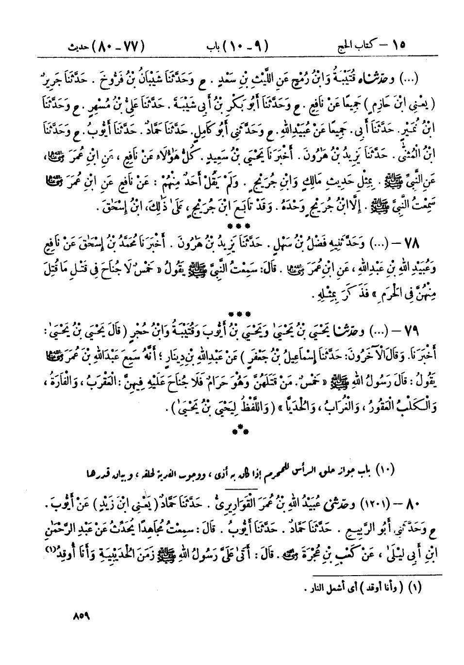 80 - (1201) وحَدَّثَنِي عُبَيْدُ اللهِ بْنُ عُمَرَ الْقَوَارِيرِيُّ، حَدَّثَنَا حَمَّادٌ يَعْنِي ابْنَ زَيْدٍ، عَنْ أَيُّوبَ، ح وحَدَّثَنِي أَبُو الرَّبِيعِ، حَدَّثَنَا حَمَّادٌ، حَدَّثَنَا أَيُّوبُ، قَالَ: سَمِعْتُ مُجَاهِدًا، يُحَدِّثُ عَنْ عَبْدِ الرَّحْمَنِ بْنِ أَبِي لَيْلَى، عَنْ كَعْبِ بْنِ عُجْرَةَ رَضِيَ اللهُ عَنْهُ، قَالَ: أَتَى عَلَيَّ رَسُولُ اللهِ صَلَّى اللهُ عَلَيْهِ وَسَلَّمَ زَمَنَ الْحُدَيْبِيَةِ وَأَنَا أُوقِدُ تَحْتَ - قَالَ الْقَوَارِيرِيُّ: قِدْرٍ لِي، وقَالَ أَبُو الرَّبِيعِ: بُرْمَةٍ لِي - وَالْقَمْلُ يَتَنَاثَرُ عَلَى وَجْهِي، فَقَالَ: «§أَيُؤْذِيكَ هَوَامُّ رَأْسِكَ؟» قَالَ قُلْتُ: نَعَمْ، قَالَ: «فَاحْلِقْ، وَصُمْ ثَلَاثَةَ أَيَّامٍ، أَوْ أَطْعِمْ سِتَّةَ مَسَاكِينَ، أَوْ انْسُكْ نَسِيكَةً» قَالَ أَيُّوبُ: فَلَا أَدْرِي بِأَيِّ ذَلِكَ بَدَأَ