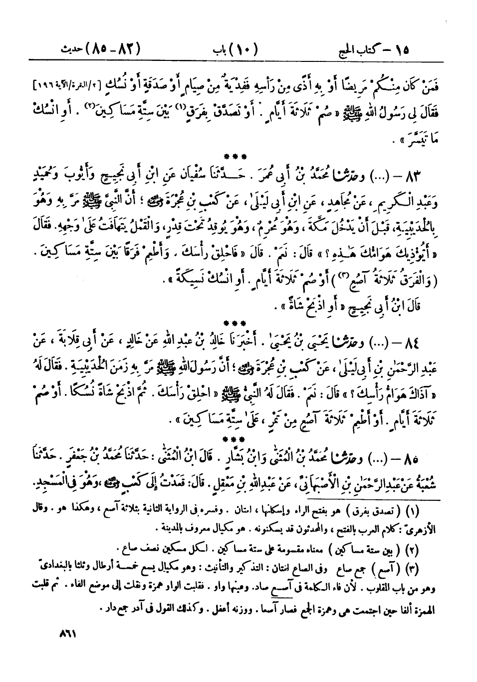 83 - (1201) وحَدَّثَنَا مُحَمَّدُ بْنُ أَبِي عُمَرَ، حَدَّثَنَا سُفْيَانُ، عَنِ ابْنِ أَبِي نَجِيحٍ، وَأَيُّوبَ، وَحُمَيْدٍ، وَعَبْدِ الْكَرِيمِ، عَنْ مُجَاهِدٍ، عَنِ ابْنِ أَبِي لَيْلَى، عَنْ كَعْبِ بْنِ عُجْرَةَ رَضِيَ اللهُ عَنْهُ، أَنَّ النَّبِيَّ صَلَّى اللهُ عَلَيْهِ وَسَلَّمَ مَرَّ بِهِ وَهُوَ بِالْحُدَيْبِيَةِ، قَبْلَ أَنْ يَدْخُلَ مَكَّةَ، وَهُوَ مُحْرِمٌ، وَهُوَ يُوقِدُ تَحْتَ قِدْرٍ، وَالْقَمْلُ يَتَهَافَتُ عَلَى وَجْهِهِ، فَقَالَ: «§أَيُؤْذِيكَ هَوَامُّكَ هَذِهِ؟» قَالَ: نَعَمْ، قَالَ: «فَاحْلِقْ رَأْسَكَ، وَأَطْعِمْ فَرَقًا بَيْنَ سِتَّةِ مَسَاكِينَ، - وَالْفَرَقُ ثَلَاثَةُ آصُعٍ -، أَوْ صُمْ ثَلَاثَةَ أَيَّامٍ، أَوْ انْسُكْ نَسِيكَةً» قَالَ ابْنُ أَبِي نَجِيحٍ: «أَوِ اذْبَحْ شَاةً»