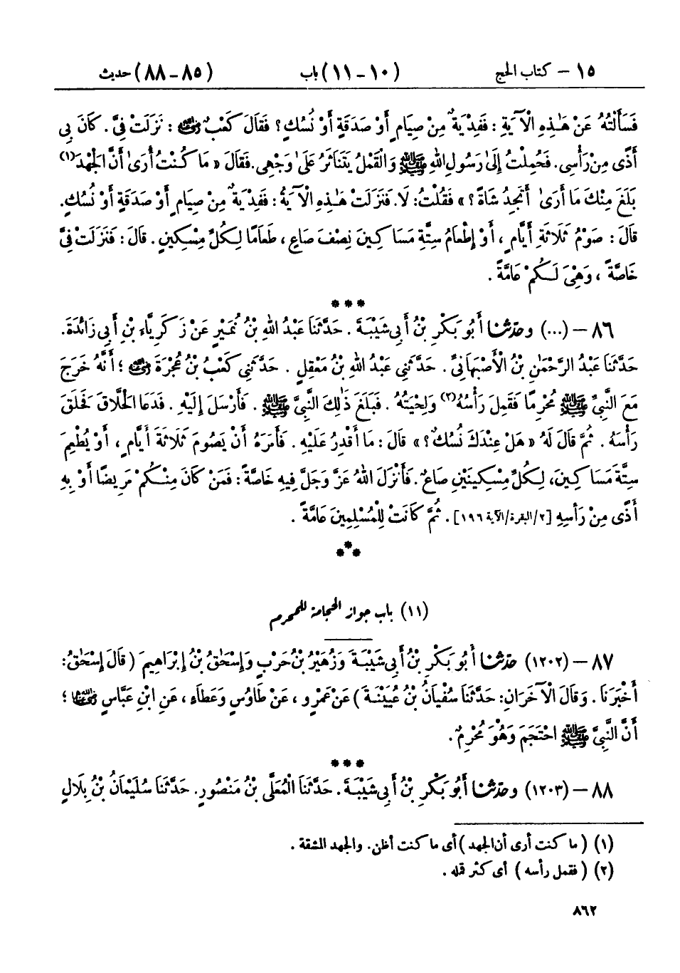 86 - (1201) وحَدَّثَنَا أَبُو بَكْرِ بْنُ أَبِي شَيْبَةَ، حَدَّثَنَا عَبْدُ اللهِ بْنُ نُمَيْرٍ، عَنْ زَكَرِيَّا بْنِ أَبِي زَائِدَةَ، حَدَّثَنَا عَبْدُ الرَّحْمَنِ بْنُ الْأَصْبَهَانِيِّ، حَدَّثَنِي عَبْدُ اللهِ بْنُ مَعْقِلٍ، حَدَّثَنِي كَعْبُ بْنُ عُجْرَةَ رَضِيَ اللهُ عَنْهُ، أَنَّهُ خَرَجَ مَعَ النَّبِيِّ صَلَّى اللهُ عَلَيْهِ وَسَلَّمَ مُحْرِمًا، فَقَمِلَ رَأْسُهُ وَلِحْيَتُهُ، فَبَلَغَ ذَلِكَ النَّبِيَّ صَلَّى اللهُ عَلَيْهِ وَسَلَّمَ، فَأَرْسَلَ إِلَيْهِ فَدَعَا الْحَلَّاقَ، فَحَلَقَ رَأْسَهُ، ثُمَّ قَالَ لَهُ: «§هَلْ عِنْدَكَ نُسُكٌ؟» قَالَ: مَا أَقْدِرُ عَلَيْهِ، «فَأَمَرَهُ أَنْ يَصُومَ ثَلَاثَةَ أَيَّامٍ، أَوْ يُطْعِمَ سِتَّةَ مَسَاكِينَ، لِكُلِّ مِسْكِينَيْنِ صَاعٌ»، فَأَنْزَلَ اللهُ عَزَّ وَجَلَّ فِيهِ خَاصَّةً: {فَمَنْ كَانَ مِنْكُمْ مَرِيضًا أَوْ بِهِ أَذًى مِنْ رَأْسِهِ} [البقرة: 196] ثُمَّ كَانَتْ لِلْمُسْلِمِينَ عَامَّةً