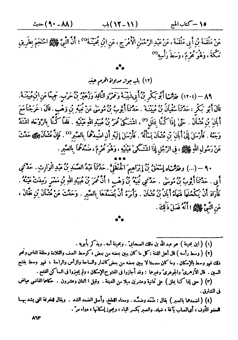 89 - (1204) حَدَّثَنَا أَبُو بَكْرِ بْنُ أَبِي شَيْبَةَ، وَعَمْرٌو النَّاقِدُ، وَزُهَيْرُ بْنُ حَرْبٍ، جَمِيعًا عَنِ ابْنِ عُيَيْنَةَ - قَالَ أَبُو بَكْرٍ: حَدَّثَنَا سُفْيَانُ بْنُ عُيَيْنَةَ - حَدَّثَنَا أَيُّوبُ بْنُ مُوسَى، عَنْ نُبَيْهِ بْنِ وَهْبٍ، قَالَ: خَرَجْنَا مَعَ أَبَانَ بْنِ عُثْمَانَ حَتَّى إِذَا كُنَّا بِمَلَلٍ، اشْتَكَى عُمَرُ بْنُ عُبَيْدِ اللهِ عَيْنَيْهِ، فَلَمَّا كُنَّا بِالرَّوْحَاءِ اشْتَدَّ وَجَعُهُ فَأَرْسَلَ إِلَى أَبَانَ بْنِ عُثْمَانَ يَسْأَلُهُ، فَأَرْسَلَ إِلَيْهِ أَنِ اضْمِدْهُمَا بِالصَّبِرِ، فَإِنَّ عُثْمَانَ رَضِيَ اللهُ عَنْهُ، حَدَّثَ عَنْ رَسُولِ اللهِ صَلَّى اللهُ عَلَيْهِ وَسَلَّمَ فِي الرَّجُلِ «§إِذَا اشْتَكَى عَيْنَيْهِ، وَهُوَ مُحْرِمٌ ضَمَّدَهُمَا بِالصَّبِرِ»