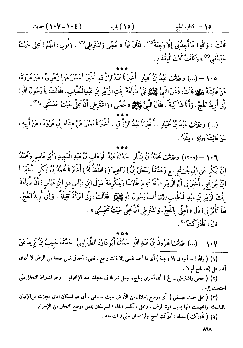 105 - (1207) وحَدَّثَنَا عَبْدُ بْنُ حُمَيْدٍ، أَخْبَرَنَا عَبْدُ الرَّزَّاقِ، أَخْبَرَنَا مَعْمَرٌ، عَنِ الزُّهْرِيِّ، عَنْ عُرْوَةَ، عَنْ عَائِشَةَ رَضِيَ اللهُ عَنْهَا، قَالَتْ: دَخَلَ النَّبِيُّ صَلَّى اللهُ عَلَيْهِ وَسَلَّمَ عَلَى ضُبَاعَةَ بِنْتِ الزُّبَيْرِ بْنِ عَبْدِ الْمُطَّلِبِ، فَقَالَتْ: يَا رَسُولَ اللهِ، إِنِّي أُرِيدُ الْحَجَّ، وَأَنَا شَاكِيَةٌ، فَقَالَ النَّبِيُّ صَلَّى اللهُ عَلَيْهِ وَسَلَّمَ: «§حُجِّي، وَاشْتَرِطِي أَنَّ مَحِلِّي حَيْثُ حَبَسْتَنِي»