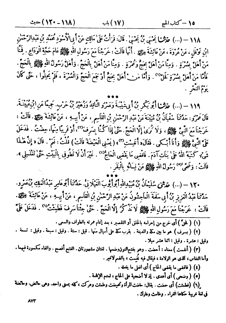 118 - (1211) حَدَّثَنَا يَحْيَى بْنُ يَحْيَى، قَالَ: قَرَأْتُ عَلَى مَالِكٍ، عَنْ أَبِي الْأَسْوَدِ مُحَمَّدِ بْنِ عَبْدِ الرَّحْمَنِ بْنِ نَوْفَلٍ، عَنْ عُرْوَةَ، عَنْ عَائِشَةَ رَضِيَ اللهُ عَنْهَا، أَنَّهَا قَالَتْ: خَرَجْنَا مَعَ رَسُولِ اللهِ صَلَّى اللهُ عَلَيْهِ وَسَلَّمَ عَامَ حَجَّةِ الْوَدَاعِ، فَمِنَّا مَنْ أَهَلَّ بِعُمْرَةٍ، وَمِنَّا مَنْ أَهَلَّ بِحَجٍّ وَعُمْرَةٍ، وَمِنَّا مَنْ أَهَلَّ بِالْحَجِّ، «§وَأَهَلَّ رَسُولُ اللهِ صَلَّى اللهُ عَلَيْهِ وَسَلَّمَ بِالْحَجِّ»، فَأَمَّا مَنْ أَهَلَّ بِعُمْرَةٍ فَحَلَّ، وَأَمَّا مَنْ أَهَلَّ بِحَجٍّ أَوْ جَمَعَ الْحَجَّ وَالْعُمْرَةَ، فَلَمْ يَحِلُّوا، حَتَّى كَانَ يَوْمُ النَّحْرِ