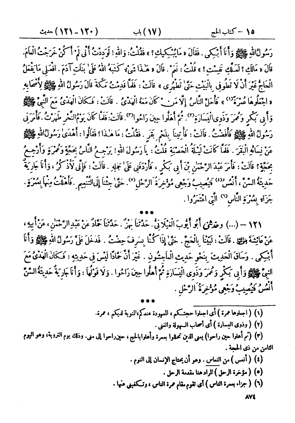 121 - (1211) وحَدَّثَنِي أَبُو أَيُّوبَ الْغَيْلَانِيُّ، حَدَّثَنَا بَهْزٌ، حَدَّثَنَا حَمَّادٌ، عَنْ عَبْدِ الرَّحْمَنِ، عَنْ أَبِيهِ، عَنْ عَائِشَةَ رَضِيَ اللهُ عَنْهَا، قَالَتْ: لَبَّيْنَا بِالْحَجِّ حَتَّى إِذَا كُنَّا بِسَرِفَ حِضْتُ، فَدَخَلَ عَلَيَّ رَسُولُ اللهِ صَلَّى اللهُ عَلَيْهِ وَسَلَّمَ، وَأَنَا أَبْكِي، وَسَاقَ الْحَدِيثَ بِنَحْوِ حَدِيثِ الْمَاجِشُونِ، غَيْرَ أَنَّ حَمَّادًا لَيْسَ فِي حَدِيثِهِ: فَكَانَ الْهَدْيُ مَعَ النَّبِيِّ صَلَّى اللهُ عَلَيْهِ وَسَلَّمَ وَأَبِي بَكْرٍ، وَعُمَرَ، وَذَوِي الْيَسَارَةِ، ثُمَّ أَهَلُّوا حِينَ رَاحُوا وَلَا قَوْلُهَا وَأَنَا جَارِيَةٌ حَدِيثَةُ السِّنِّ أَنْعَسُ فَيُصِيبُ وَجْهِي مُؤْخِرَةَ الرَّحْلِ