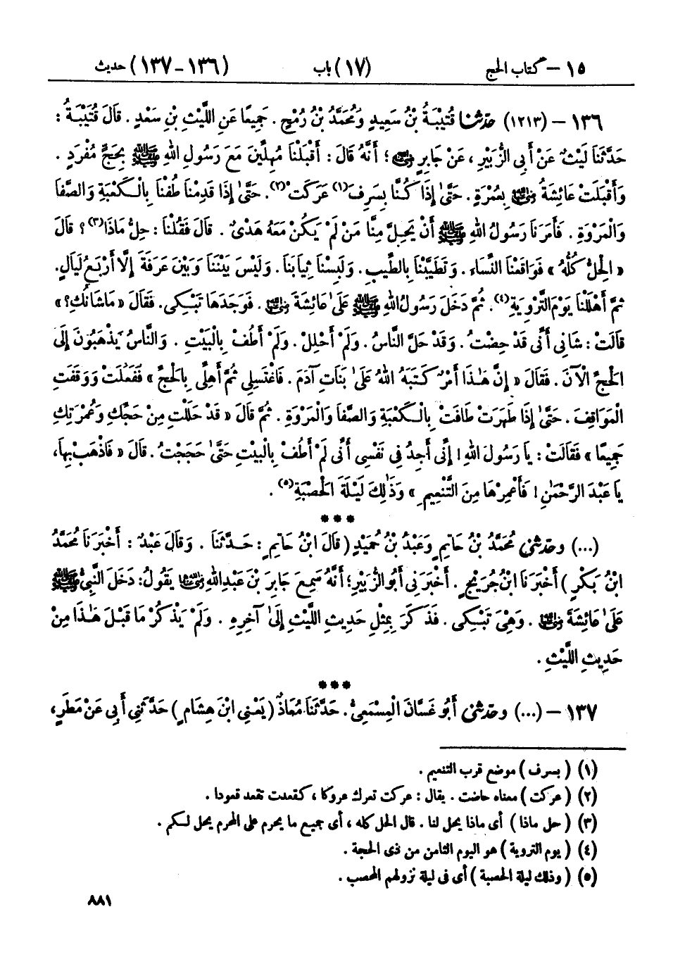136 - (1213) حَدَّثَنَا قُتَيْبَةُ بْنُ سَعِيدٍ، وَمُحَمَّدُ بْنُ رُمْحٍ، جَمِيعًا عَنِ اللَّيْثِ بْنِ سَعْدٍ، - قَالَ قُتَيْبَةُ: حَدَّثَنَا، لَيْثٌ - عَنْ أَبِي الزُّبَيْرِ، عَنْ جَابِرٍ رَضِيَ اللهُ عَنْهُ، أَنَّهُ قَالَ: أَقْبَلْنَا مُهِلِّينَ مَعَ رَسُولِ اللهِ صَلَّى اللهُ عَلَيْهِ وَسَلَّمَ بِحَجٍّ مُفْرَدٍ، وَأَقْبَلَتْ عَائِشَةُ رَضِيَ اللهُ عَنْهَا، بِعُمْرَةٍ حَتَّى إِذَا كُنَّا بِسَرِفَ عَرَكَتْ، حَتَّى إِذَا قَدِمْنَا طُفْنَا بِالْكَعْبَةِ وَالصَّفَا وَالْمَرْوَةِ، فَأَمَرَنَا رَسُولُ اللهِ صَلَّى اللهُ عَلَيْهِ وَسَلَّمَ أَنْ يَحِلَّ مِنَّا مَنْ لَمْ يَكُنْ مَعَهُ هَدْيٌ، قَالَ فَقُلْنَا: حِلُّ مَاذَا؟ قَالَ: «الْحِلُّ كُلُّهُ» فَوَاقَعْنَا النِّسَاءَ، وَتَطَيَّبْنَا بِالطِّيبِ، وَلَبِسْنَا ثِيَابَنَا، وَلَيْسَ بَيْنَنَا وَبَيْنَ عَرَفَةَ إِلَّا أَرْبَعُ لَيَالٍ، ثُمَّ أَهْلَلْنَا يَوْمَ التَّرْوِيَةِ، ثُمَّ دَخَلَ رَسُولُ اللهِ صَلَّى اللهُ عَلَيْهِ وَسَلَّمَ عَلَى عَائِشَةَ رَضِيَ اللهُ عَنْهَا، فَوَجَدَهَا تَبْكِي، فَقَالَ: «مَا شَأْنُكِ؟» قَالَتْ: شَأْنِي أَنِّي قَدْ حِضْتُ، وَقَدْ حَلَّ النَّاسُ، وَلَمْ أَحْلِلْ، وَلَمْ أَطُفْ بِالْبَيْتِ وَالنَّاسُ يَذْهَبُونَ إِلَى الْحَجِّ الْآنَ، فَقَالَ: «إِنَّ §هَذَا أَمْرٌ كَتَبَهُ اللهُ عَلَى بَنَاتِ آدَمَ، فَاغْتَسِلِي، ثُمَّ أَهِلِّي بِالْحَجِّ» فَفَعَلَتْ وَوَقَفَتِ الْمَوَاقِفَ، حَتَّى إِذَا طَهَرَتْ طَافَتْ بِالْكَعْبَةِ وَالصَّفَا وَالْمَرْوَةِ، ثُمَّ قَالَ: «قَدْ حَلَلْتِ مِنْ حَجِّكِ وَعُمْرَتِكِ جَمِيعًا» فَقَالَتْ: يَا رَسُولَ اللهِ، إِنِّي أَجِدُ فِي نَفْسِي أَنِّي لَمْ أَطُفْ بِالْبَيْتِ حَتَّى حَجَجْتُ، قَالَ: «فَاذْهَبْ بِهَا، يَا عَبْدَ الرَّحْمَنِ، فَأَعْمِرْهَا مِنَ التَّنْعِيمِ» وَذَلِكَ لَيْلَةَ الْحَصْبَةِ