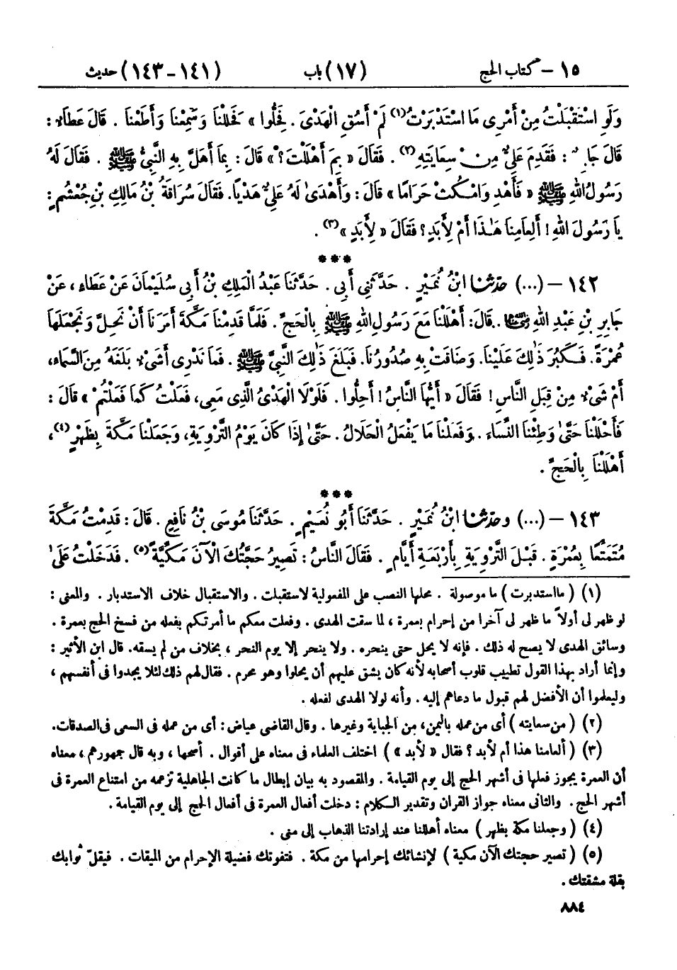 143 - (1216) وحَدَّثَنَا ابْنُ نُمَيْرٍ، حَدَّثَنَا أَبُو نُعَيْمٍ، حَدَّثَنَا مُوسَى بْنُ نَافِعٍ، قَالَ: قَدِمْتُ مَكَّةَ مُتَمَتِّعًا بِعُمْرَةٍ، قَبْلَ التَّرْوِيَةِ بِأَرْبَعَةِ أَيَّامٍ، فَقَالَ النَّاسُ: تَصِيرُ حَجَّتُكَ الْآنَ مَكِّيَّةً، فَدَخَلْتُ عَلَى عَطَاءِ بْنِ أَبِي رَبَاحٍ فَاسْتَفْتَيْتُهُ، فَقَالَ عَطَاءٌ: حَدَّثَنِي جَابِرُ بْنُ عَبْدِ اللهِ الْأَنْصَارِيُّ رَضِيَ اللهُ عَنْهُمَا، أَنَّهُ حَجَّ مَعَ رَسُولِ اللهِ صَلَّى اللهُ عَلَيْهِ وَسَلَّمَ عَامَ سَاقَ الْهَدْيَ مَعَهُ، وَقَدْ أَهَلُّوا بِالْحَجِّ مُفْرَدًا، فَقَالَ رَسُولُ اللهِ صَلَّى اللهُ عَلَيْهِ وَسَلَّمَ: «§أَحِلُّوا مِنْ إِحْرَامِكُمْ، فَطُوفُوا بِالْبَيْتِ وَبَيْنَ الصَّفَا وَالْمَرْوَةِ، وَقَصِّرُوا، وَأَقِيمُوا حَلَالًا حَتَّى إِذَا كَانَ يَوْمُ التَّرْوِيَةِ فَأَهِلُّوا بِالْحَجِّ، وَاجْعَلُوا الَّتِي قَدِمْتُمْ بِهَا مُتْعَةً» قَالُوا: كَيْفَ نَجْعَلُهَا مُتْعَةً وَقَدْ سَمَّيْنَا الْحَجَّ؟ قَالَ: «افْعَلُوا مَا آمُرُكُمْ بِهِ، فَإِنِّي لَوْلَا أَنِّي سُقْتُ الْهَدْيَ، لَفَعَلْتُ مِثْلَ الَّذِي أَمَرْتُكُمْ بِهِ، وَلَكِنْ لَا يَحِلُّ مِنِّي حَرَامٌ، حَتَّى يَبْلُغَ الْهَدْيُ مَحِلَّهُ» فَفَعَلُوا