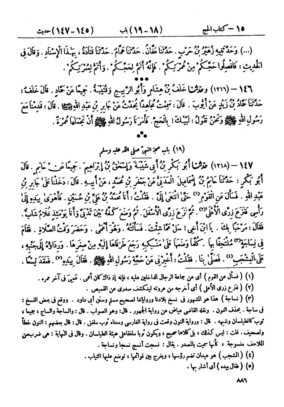 147 - (1218) حَدَّثَنَا أَبُو بَكْرِ بْنُ أَبِي شَيْبَةَ، وَإِسْحَاقُ بْنُ إِبْرَاهِيمَ، جَمِيعًا عَنْ حَاتِمٍ، قَالَ أَبُو بَكْرٍ: حَدَّثَنَا حَاتِمُ بْنُ إِسْمَاعِيلَ الْمَدَنِيُّ، عَنْ جَعْفَرِ بْنِ مُحَمَّدٍ، عَنْ أَبِيهِ، قَالَ: دَخَلْنَا عَلَى جَابِرِ بْنِ عَبْدِ اللهِ، فَسَأَلَ عَنِ الْقَوْمِ حَتَّى انْتَهَى إِلَيَّ، فَقُلْتُ: أَنَا مُحَمَّدُ بْنُ عَلِيِّ بْنِ حُسَيْنٍ، فَأَهْوَى بِيَدِهِ إِلَى رَأْسِي فَنَزَعَ زِرِّي الْأَعْلَى، ثُمَّ نَزَعَ زِرِّي الْأَسْفَلَ، ثُمَّ وَضَعَ كَفَّهُ بَيْنَ ثَدْيَيَّ وَأَنَا يَوْمَئِذٍ غُلَامٌ شَابٌّ، فَقَالَ: مَرْحَبًا بِكَ، يَا ابْنَ أَخِي، سَلْ عَمَّا شِئْتَ، فَسَأَلْتُهُ، وَهُوَ أَعْمَى، وَحَضَرَ وَقْتُ الصَّلَاةِ، فَقَامَ فِي نِسَاجَةٍ مُلْتَحِفًا بِهَا، كُلَّمَا وَضَعَهَا عَلَى مَنْكِبِهِ رَجَعَ طَرَفَاهَا إِلَيْهِ مِنْ صِغَرِهَا، وَرِدَاؤُهُ إِلَى جَنْبِهِ، عَلَى الْمِشْجَبِ، فَصَلَّى بِنَا، فَقُلْتُ: أَخْبِرْنِي عَنْ حَجَّةِ رَسُولِ اللهِ صَلَّى اللهُ عَلَيْهِ وَسَلَّمَ، فَقَالَ: بِيَدِهِ فَعَقَدَ تِسْعًا -[887]-، فَقَالَ: إِنَّ رَسُولَ اللهِ صَلَّى اللهُ عَلَيْهِ وَسَلَّمَ مَكَثَ تِسْعَ سِنِينَ لَمْ يَحُجَّ، ثُمَّ أَذَّنَ فِي النَّاسِ فِي الْعَاشِرَةِ، أَنَّ رَسُولَ اللهِ صَلَّى اللهُ عَلَيْهِ وَسَلَّمَ حَاجٌّ، فَقَدِمَ الْمَدِينَةَ بَشَرٌ كَثِيرٌ، كُلُّهُمْ يَلْتَمِسُ أَنْ يَأْتَمَّ بِرَسُولِ اللهِ صَلَّى اللهُ عَلَيْهِ وَسَلَّمَ، وَيَعْمَلَ مِثْلَ عَمَلِهِ، فَخَرَجْنَا مَعَهُ، حَتَّى أَتَيْنَا ذَا الْحُلَيْفَةِ، فَوَلَدَتْ أَسْمَاءُ بِنْتُ عُمَيْسٍ مُحَمَّدَ بْنَ أَبِي بَكْرٍ، فَأَرْسَلَتْ إِلَى رَسُولِ اللهِ صَلَّى اللهُ عَلَيْهِ وَسَلَّمَ: كَيْفَ أَصْنَعُ؟ قَالَ: «§اغْتَسِلِي، وَاسْتَثْفِرِي بِثَوْبٍ وَأَحْرِمِي» فَصَلَّى رَسُولُ اللهِ صَلَّى اللهُ عَلَيْهِ وَسَلَّمَ فِي الْمَسْجِدِ، ثُمَّ رَكِبَ الْقَصْوَاءَ، حَتَّى إِذَا اسْتَوَتْ بِهِ نَاقَتُهُ عَلَى الْبَيْدَاءِ، نَظَرْتُ إِلَى مَدِّ بَصَرِي بَيْنَ يَدَيْهِ، مِنْ رَاكِبٍ وَمَاشٍ، وَعَنْ يَمِينِهِ مِثْلَ ذَلِكَ، وَعَنْ يَسَارِهِ مِثْلَ ذَلِكَ، وَمِنْ خَلْفِهِ مِثْلَ ذَلِكَ، وَرَسُولُ اللهِ صَلَّى اللهُ عَلَيْهِ وَسَلَّمَ بَيْنَ أَظْهُرِنَا، وَعَلَيْهِ يَنْزِلُ الْقُرْآنُ، وَهُوَ يَعْرِفُ تَأْوِيلَهُ، وَمَا عَمِلَ بِهِ مِنْ شَيْءٍ عَمِلْنَا بِهِ، فَأَهَلَّ بِالتَّوْحِيدِ «لَبَّيْكَ اللهُمَّ، لَبَّيْكَ، لَبَّيْكَ لَا شَرِيكَ لَكَ لَبَّيْكَ، إِنَّ الْحَمْدَ وَالنِّعْمَةَ لَكَ، وَالْمُلْكَ لَا شَرِيكَ لَكَ» وَأَهَلَّ النَّاسُ بِهَذَا الَّذِي يُهِلُّونَ بِهِ، فَلَمْ يَرُدَّ رَسُولُ اللهِ صَلَّى اللهُ عَلَيْهِ وَسَلَّمَ عَلَيْهِمْ شَيْئًا مِنْهُ، وَلَزِمَ رَسُولُ اللهِ صَلَّى اللهُ عَلَيْهِ وَسَلَّمَ تَلْبِيَتَهُ، قَالَ جَابِرٌ رَضِيَ اللهُ عَنْهُ: لَسْنَا نَنْوِي إِلَّا الْحَجَّ، لَسْنَا نَعْرِفُ الْعُمْرَةَ، حَتَّى إِذَا أَتَيْنَا الْبَيْتَ مَعَهُ، اسْتَلَمَ الرُّكْنَ فَرَمَلَ ثَلَاثًا وَمَشَى أَرْبَعًا، ثُمَّ نَفَذَ إِلَى مَقَامِ إِبْرَاهِيمَ عَلَيْهِ السَّلَام، فَقَرَأَ: {وَاتَّخِذُوا مِنْ مَقَامِ إِبْرَاهِيمَ مُصَلًّى} [البقرة: 125] فَجَعَلَ الْمَقَامَ بَيْنَهُ وَبَيْنَ الْبَيْتِ، فَكَانَ أَبِي -[888]- يَقُولُ - وَلَا أَعْلَمُهُ ذَكَرَهُ إِلَّا عَنِ النَّبِيِّ صَلَّى اللهُ عَلَيْهِ وَسَلَّمَ -: كَانَ يَقْرَأُ فِي الرَّكْعَتَيْنِ قُلْ هُوَ اللهُ أَحَدٌ وَقُلْ يَا أَيُّهَا الْكَافِرُونَ، ثُمَّ رَجَعَ إِلَى الرُّكْنِ فَاسْتَلَمَهُ، ثُمَّ خَرَجَ مِنَ الْبَابِ إِلَى الصَّفَا، فَلَمَّا دَنَا مِنَ الصَّفَا قَرَأَ: {إِنَّ الصَّفَا والْمَرْوَةَ مِنْ شَعَائِرِ اللهِ}