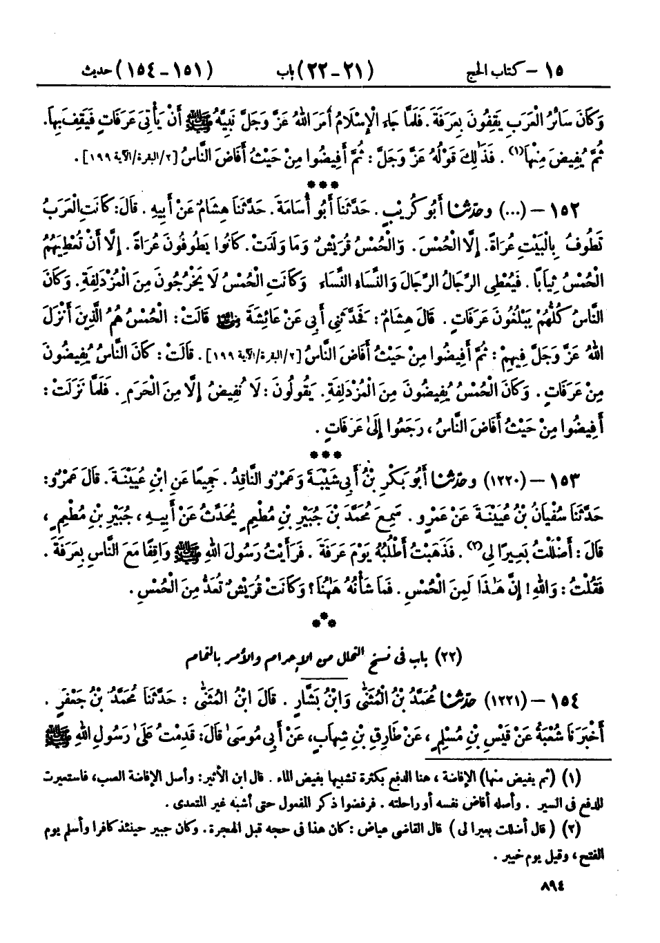 152 - (1219) وحَدَّثَنَا أَبُو كُرَيْبٍ، حَدَّثَنَا أَبُو أُسَامَةَ، حَدَّثَنَا هِشَامٌ، عَنْ أَبِيهِ، قَالَ: كَانَتِ الْعَرَبُ تَطُوفُ بِالْبَيْتِ عُرَاةً، إِلَّا الْحُمْسَ، وَالْحُمْسُ قُرَيْشٌ وَمَا وَلَدَتْ، كَانُوا يَطُوفُونَ عُرَاةً، إِلَّا أَنْ تُعْطِيَهُمُ الْحُمْسُ ثِيَابًا، فَيُعْطِي الرِّجَالُ الرِّجَالَ، وَالنِّسَاءُ النِّسَاءَ، وَكَانَتِ الْحُمْسُ لَا يَخْرُجُونَ مِنَ الْمُزْدَلِفَةِ، وَكَانَ النَّاسُ كُلُّهُمْ يَبْلُغُونَ عَرَفَاتٍ، قَالَ هِشَامٌ: فَحَدَّثَنِي أَبِي، عَنْ عَائِشَةَ رَضِيَ اللهُ عَنْهَا، قَالَتْ: " §الْحُمْسُ هُمُ الَّذِينَ أَنْزَلَ اللهُ عَزَّ وَجَلَّ فِيهِمْ: {ثُمَّ أَفِيضُوا مِنْ حَيْثُ أَفَاضَ النَّاسُ} [البقرة: 199] قَالَتْ: كَانَ النَّاسُ يُفِيضُونَ مِنْ عَرَفَاتٍ، وَكَانَ الْحُمْسُ يُفِيضُونَ مِنَ الْمُزْدَلِفَةِ، يَقُولُونَ: لَا نُفِيضُ إِلَّا مِنَ الْحَرَمِ، فَلَمَّا نَزَلَتْ: {أَفِيضُوا مِنْ حَيْثُ أَفَاضَ النَّاسُ} [البقرة: 199] رَجَعُوا إِلَى عَرَفَاتٍ "