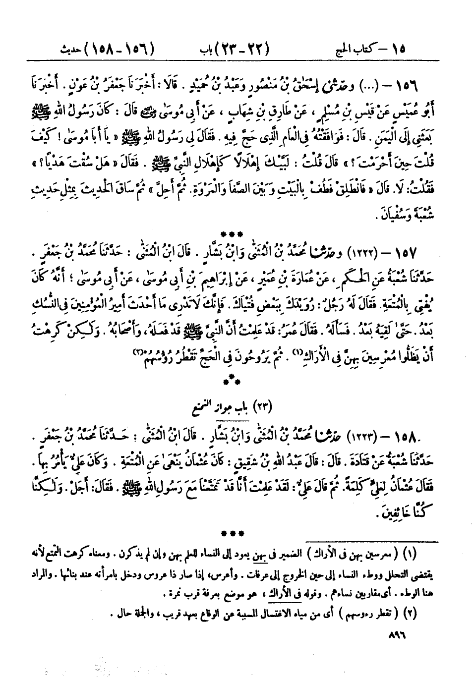 157 - (1222) وحَدَّثَنَا مُحَمَّدُ بْنُ الْمُثَنَّى، وَابْنُ بَشَّارٍ، قَالَ ابْنُ الْمُثَنَّى: حَدَّثَنَا مُحَمَّدُ بْنُ جَعْفَرٍ، حَدَّثَنَا شُعْبَةُ، عَنِ الْحَكَمِ، عَنْ عُمَارَةَ بْنِ عُمَيْرٍ، عَنْ إِبْرَاهِيمَ بْنِ أَبِي مُوسَى، عَنْ أَبِي مُوسَى، أَنَّهُ كَانَ يُفْتِي بِالْمُتْعَةِ، فَقَالَ لَهُ رَجُلٌ: رُوَيْدَكَ بِبَعْضِ فُتْيَاكَ، فَإِنَّكَ لَا تَدْرِي مَا أَحْدَثَ أَمِيرُ الْمُؤْمِنِينَ فِي النُّسُكِ بَعْدُ، حَتَّى لَقِيَهُ بَعْدُ، فَسَأَلَهُ، فَقَالَ عُمَرُ: «§قَدْ عَلِمْتُ أَنَّ النَّبِيَّ صَلَّى اللهُ عَلَيْهِ وَسَلَّمَ قَدْ فَعَلَهُ، وَأَصْحَابُهُ، وَلَكِنْ كَرِهْتُ أَنْ يَظَلُّوا مُعْرِسِينَ بِهِنَّ فِي الْأَرَاكِ، ثُمَّ يَرُوحُونَ فِي الْحَجِّ تَقْطُرُ رُءُوسُهُمْ»