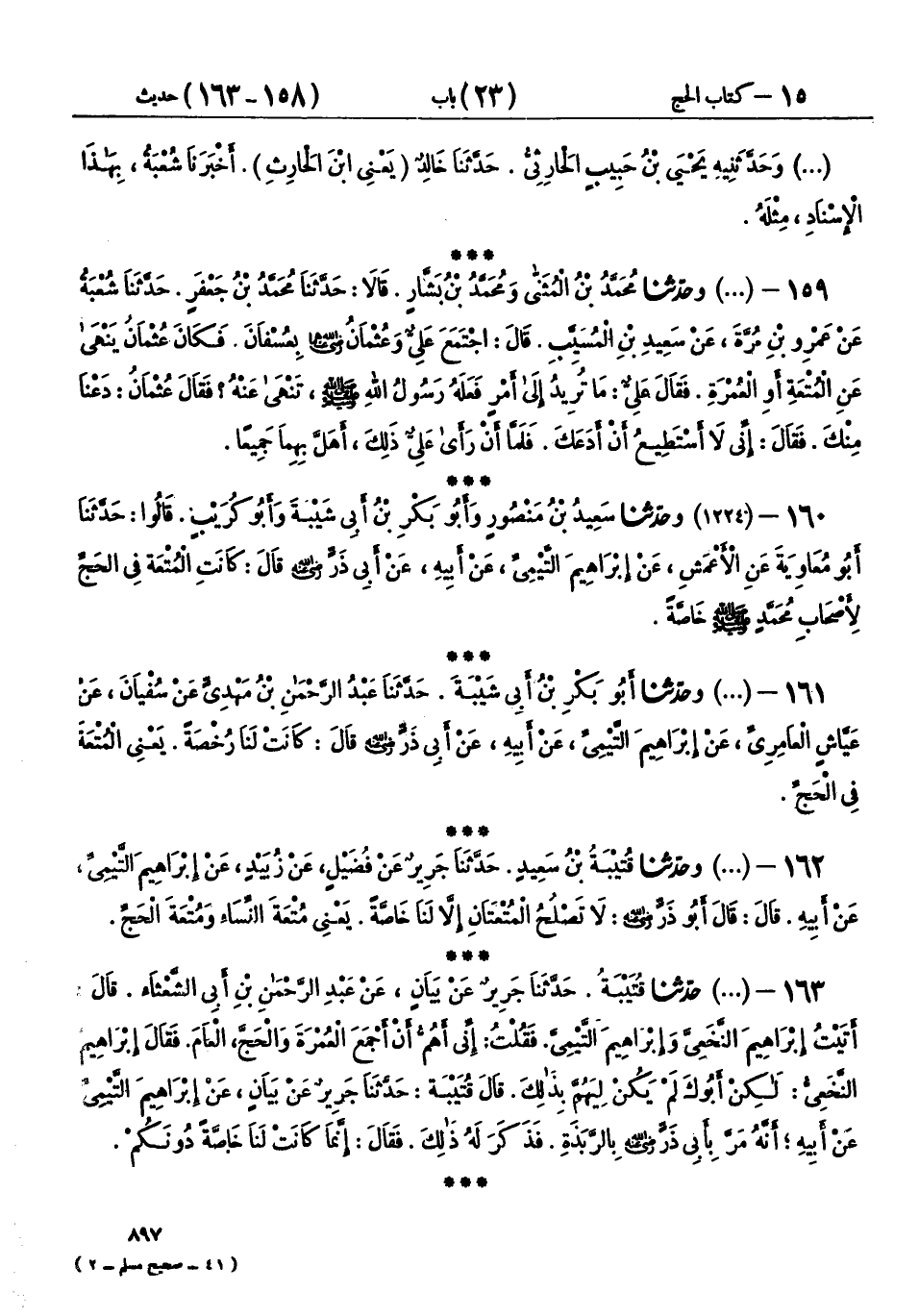 162 - (1224) وَحَدَّثَنَا قُتَيْبَةُ بْنُ سَعِيدٍ، حَدَّثَنَا جَرِيرٌ، عَنْ فُضَيْلٍ، عَنْ زُبَيْدٍ، عَنْ إِبْرَاهِيمَ التَّيْمِيِّ، عَنْ أَبِيهِ، قَالَ: قَالَ أَبُو ذَرٍّ رَضِيَ اللهُ عَنْهُ: «§لَا تَصْلُحُ الْمُتْعَتَانِ، إِلَّا لَنَا خَاصَّةً» يَعْنِي مُتْعَةَ النِّسَاءِ وَمُتْعَةَ الْحَجِّ