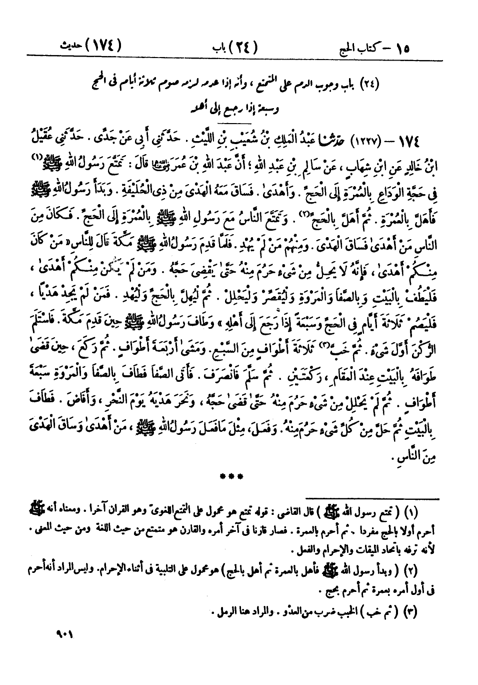 174 - (1227) حَدَّثَنَا عَبْدُ الْمَلِكِ بْنُ شُعَيْبِ بْنِ اللَّيْثِ، حَدَّثَنِي أَبِي، عَنْ جَدِّي، حَدَّثَنِي عُقَيْلُ بْنُ خَالِدٍ، عَنِ ابْنِ شِهَابٍ، عَنْ سَالِمِ بْنِ عَبْدِ اللهِ، أَنَّ عَبْدَ اللهِ بْنَ عُمَرَ رَضِيَ اللهُ عَنْهُمَا، قَالَ: تَمَتَّعَ رَسُولُ اللهِ صَلَّى اللهُ عَلَيْهِ وَسَلَّمَ فِي حَجَّةِ الْوَدَاعِ بِالْعُمْرَةِ إِلَى الْحَجِّ، وَأَهْدَى، فَسَاقَ مَعَهُ الْهَدْيَ مِنْ ذِي الْحُلَيْفَةِ، وَبَدَأَ رَسُولُ اللهِ صَلَّى اللهُ عَلَيْهِ وَسَلَّمَ فَأَهَلَّ بِالْعُمْرَةِ، ثُمَّ أَهَلَّ بِالْحَجِّ، وَتَمَتَّعَ النَّاسُ مَعَ رَسُولِ اللهِ صَلَّى اللهُ عَلَيْهِ وَسَلَّمَ بِالْعُمْرَةِ إِلَى الْحَجِّ، فَكَانَ مِنَ النَّاسِ مَنْ أَهْدَى فَسَاقَ الْهَدْيَ وَمِنْهُمْ مَنْ لَمْ يُهْدِ، فَلَمَّا قَدِمَ رَسُولُ اللهِ صَلَّى اللهُ عَلَيْهِ وَسَلَّمَ مَكَّةَ قَالَ لِلنَّاسِ: «§مَنْ كَانَ مِنْكُمْ أَهْدَى، فَإِنَّهُ لَا يَحِلُّ مِنْ شَيْءٍ حَرُمَ مِنْهُ حَتَّى يَقْضِيَ حَجَّهُ، وَمَنْ لَمْ يَكُنْ مِنْكُمْ أَهْدَى، فَلْيَطُفْ بِالْبَيْتِ وَبِالصَّفَا وَالْمَرْوَةِ وَلْيُقَصِّرْ وَلْيَحْلِلْ، ثُمَّ لِيُهِلَّ بِالْحَجِّ وَلْيُهْدِ، فَمَنْ لَمْ يَجِدْ هَدْيًا، فَلْيَصُمْ ثَلَاثَةَ أَيَّامٍ فِي الْحَجِّ وَسَبْعَةً إِذَا رَجَعَ إِلَى أَهْلِهِ» وَطَافَ رَسُولُ اللهِ صَلَّى اللهُ عَلَيْهِ وَسَلَّمَ حِينَ قَدِمَ مَكَّةَ، فَاسْتَلَمَ الرُّكْنَ أَوَّلَ شَيْءٍ، ثُمَّ خَبَّ ثَلَاثَةَ أَطْوَافٍ مِنَ السَّبْعِ، وَمَشَى أَرْبَعَةَ أَطْوَافٍ، ثُمَّ رَكَعَ، حِينَ قَضَى طَوَافَهُ بِالْبَيْتِ عِنْدَ الْمَقَامِ رَكْعَتَيْنِ، ثُمَّ سَلَّمَ فَانْصَرَفَ، فَأَتَى الصَّفَا فَطَافَ بِالصَّفَا وَالْمَرْوَةِ سَبْعَةَ أَطْوَافٍ، ثُمَّ لَمْ يَحْلِلْ مِنْ شَيْءٍ حَرُمَ مِنْهُ حَتَّى قَضَى حَجَّهُ، وَنَحَرَ هَدْيَهُ يَوْمَ النَّحْرِ، وَأَفَاضَ، فَطَافَ بِالْبَيْتِ ثُمَّ حَلَّ مِنْ كُلِّ شَيْءٍ حَرُمَ مِنْهُ، وَفَعَلَ، مِثْلَ مَا فَعَلَ رَسُولُ اللهِ صَلَّى اللهُ عَلَيْهِ وَسَلَّمَ، مَنْ أَهْدَى وَسَاقَ الْهَدْيَ مِنَ النَّاسِ