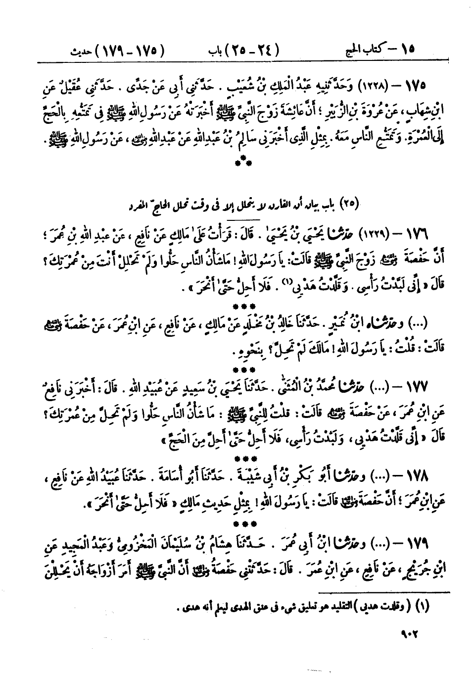 176 - (1229) حَدَّثَنَا يَحْيَى بْنُ يَحْيَى، قَالَ: قَرَأْتُ عَلَى مَالِكٍ، عَنْ نَافِعٍ، عَنْ عَبْدِ اللهِ بْنِ عُمَرَ، أَنَّ حَفْصَةَ رَضِيَ اللهُ عَنْهَا زَوْجَ النَّبِيِّ صَلَّى اللهُ عَلَيْهِ وَسَلَّمَ، قَالَتْ: يَا رَسُولَ اللهِ، مَا شَأْنُ النَّاسِ حَلُّوا وَلَمْ تَحْلِلْ أَنْتَ مِنْ عُمْرَتِكَ؟ قَالَ: «§إِنِّي لَبَّدْتُ رَأْسِي، وَقَلَّدْتُ هَدْيِي، فَلَا أَحِلُّ حَتَّى أَنْحَرَ»